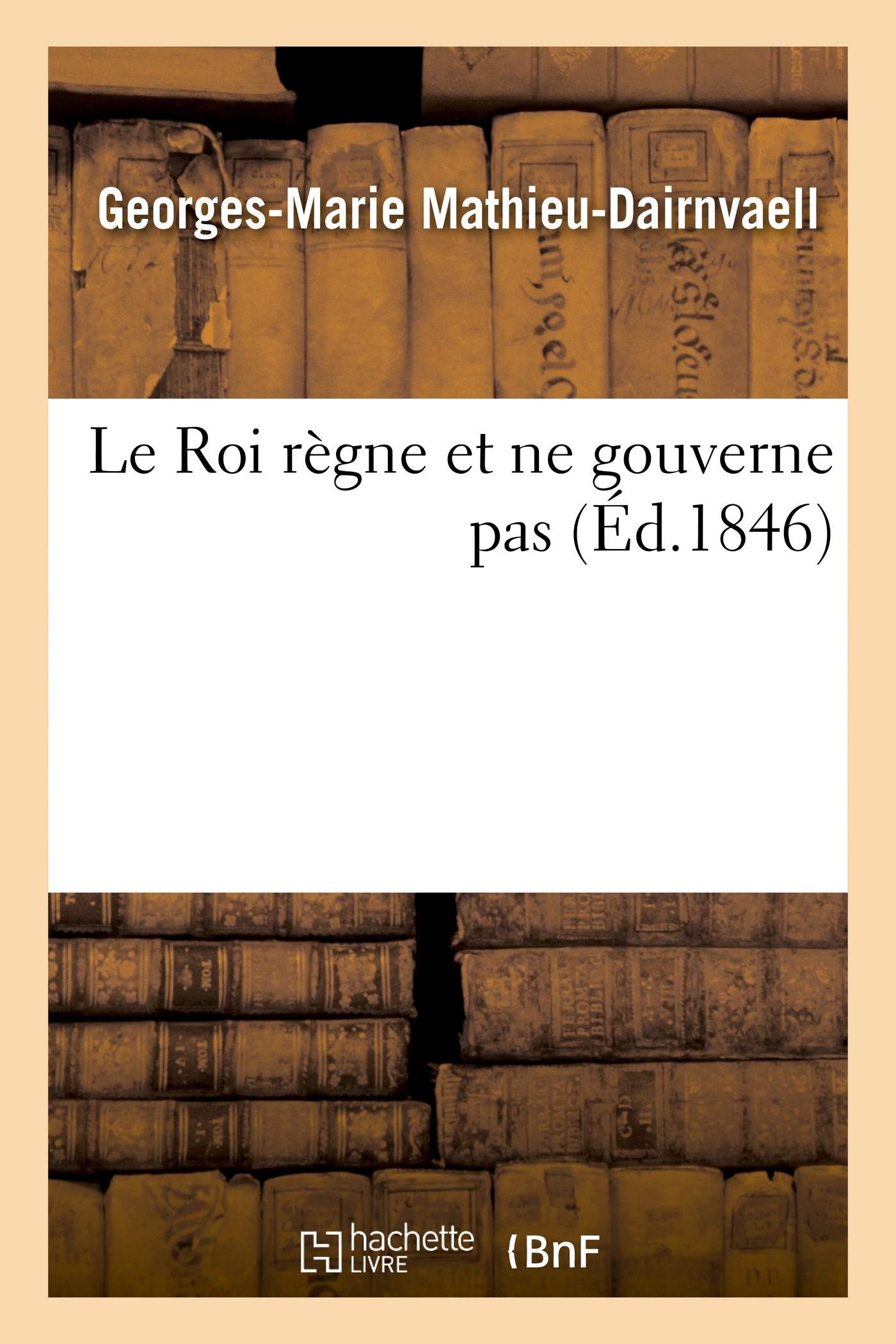Le Roi règne et ne gouverne pas, par l'auteur de "Feu Timon" [G.-M. Mathieu-Dairnvaell] Date de l'édition originale : 1846 Le présent ouvrage s'inscrit dans une politique de conservation patrimoniale des ouvrages de la littérature Française mise en place avec la BNF. HACHETTE LIVRE et la BNF proposent ainsi un catalogue de titres indisponibles, la BNF ayant numérisé ces œuvres et HACHETTE LIVRE les imprimant à la demande. Certains de ces ouvrages reflètent des courants de pensée caractéristiques de leur époque, mais qui seraient aujourd'hui jugés condamnables. Ils n'en appartiennent pas moins à l'histoire des idées en France et sont susceptibles de présenter un intérêt scientifique ou historique. Le sens de notre démarche éditoriale consiste ainsi à permettre l'accès à ces œuvres sans pour autant que nous en cautionnions en aucune façon le contenu. Pour plus d'informations, rendez-vous sur www.hachettebnf.fr