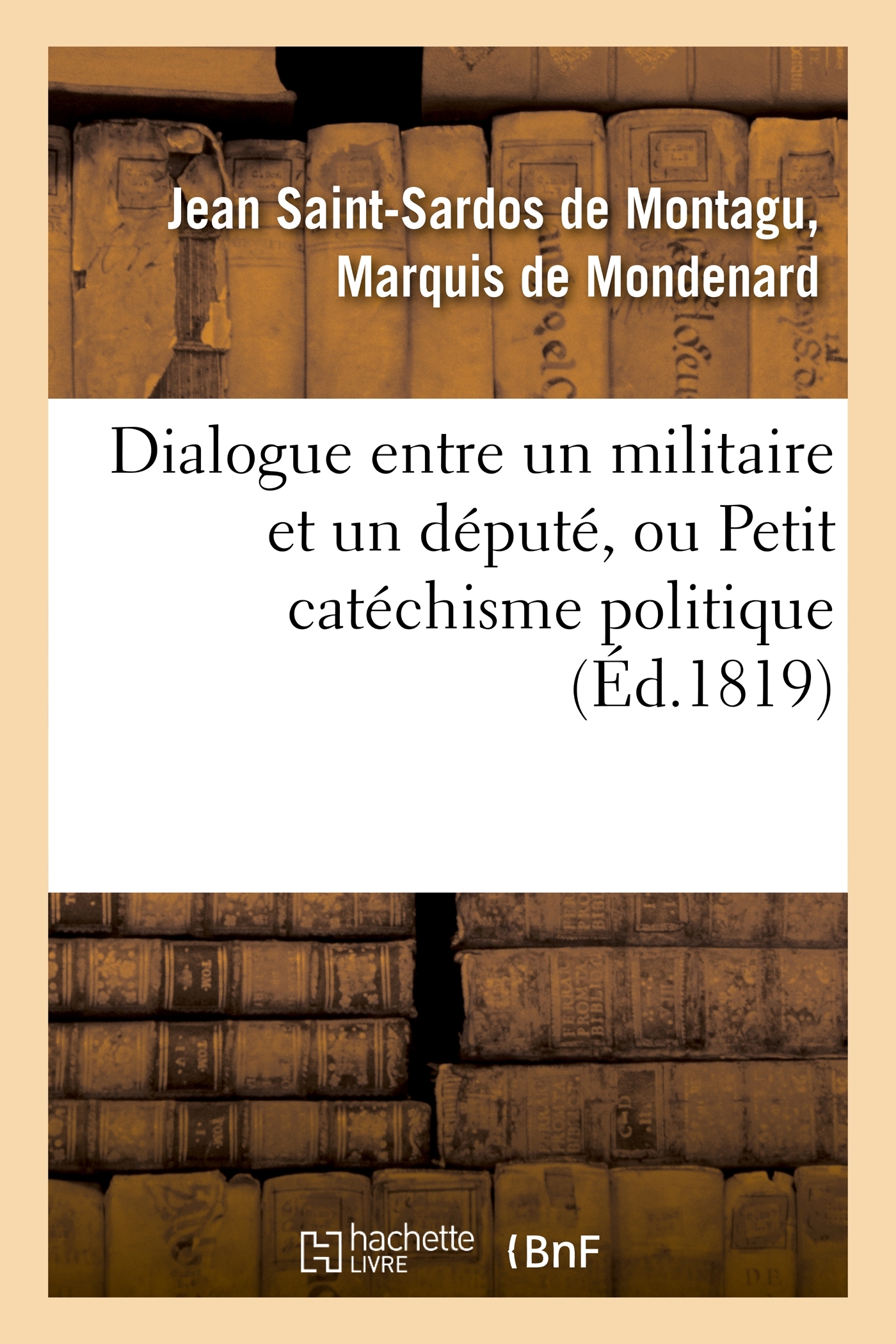 Dialogue entre un militaire et un député, ou Petit catéchisme politique à l'usage des amis de la liberté, de la légitimité et de l'industrie, par l'auteur des "Considérations sur l'organisation sociale",... [le Mis de Mondenard.] Date de l'édition originale : 1819 Le présent ouvrage s'inscrit dans une politique de conservation patrimoniale des ouvrages de la littérature Française mise en place avec la BNF. HACHETTE LIVRE et la BNF proposent ainsi un catalogue de titres indisponibles, la BNF ayant numérisé ces œuvres et HACHETTE LIVRE les imprimant à la demande. Certains de ces ouvrages reflètent des courants de pensée caractéristiques de leur époque, mais qui seraient aujourd'hui jugés condamnables. Ils n'en appartiennent pas moins à l'histoire des idées en France et sont susceptibles de présenter un intérêt scientifique ou historique. Le sens de notre démarche éditoriale consiste ainsi à permettre l'accès à ces œuvres sans pour autant que nous en cautionnions en aucune façon le contenu. Pour plus d'informations, rendez-vous sur www.hachettebnf.fr