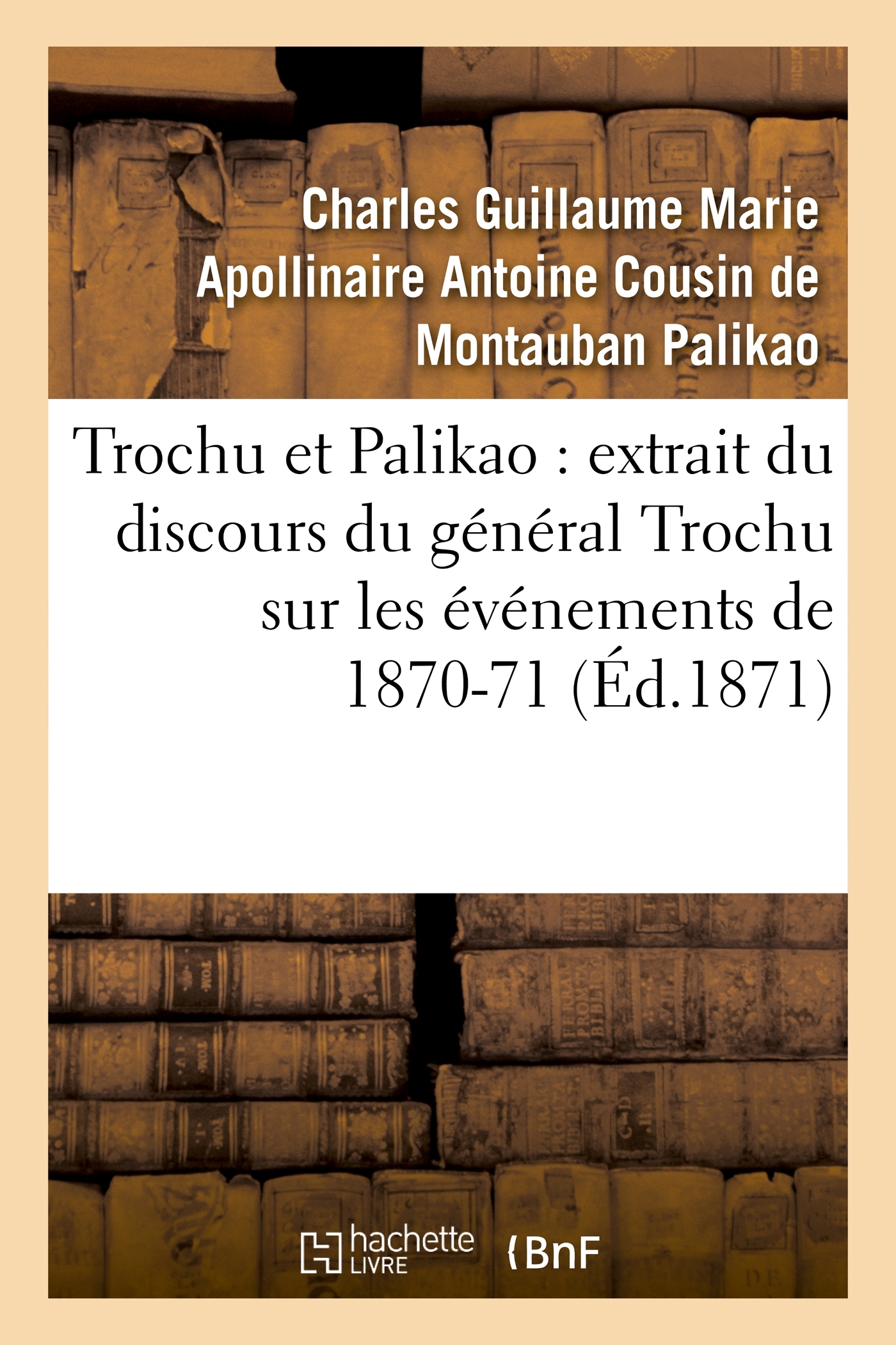 Trochu et Palikao : extrait du discours du général Trochu sur les événements de 1870-71, lettre du général comte de Palikao [au président de la Commission d'enquête sur les événements du 4 septembre 1870] Date de l'édition originale : 1871 Le présent ouvrage s'inscrit dans une politique de conservation patrimoniale des ouvrages de la littérature Française mise en place avec la BNF. HACHETTE LIVRE et la BNF proposent ainsi un catalogue de titres indisponibles, la BNF ayant numérisé ces œuvres et HACHETTE LIVRE les imprimant à la demande. Certains de ces ouvrages reflètent des courants de pensée caractéristiques de leur époque, mais qui seraient aujourd'hui jugés condamnables. Ils n'en appartiennent pas moins à l'histoire des idées en France et sont susceptibles de présenter un intérêt scientifique ou historique. Le sens de notre démarche éditoriale consiste ainsi à permettre l'accès à ces œuvres sans pour autant que nous en cautionnions en aucune façon le contenu. Pour plus d'informations, rendez-vous sur www.hachettebnf.fr