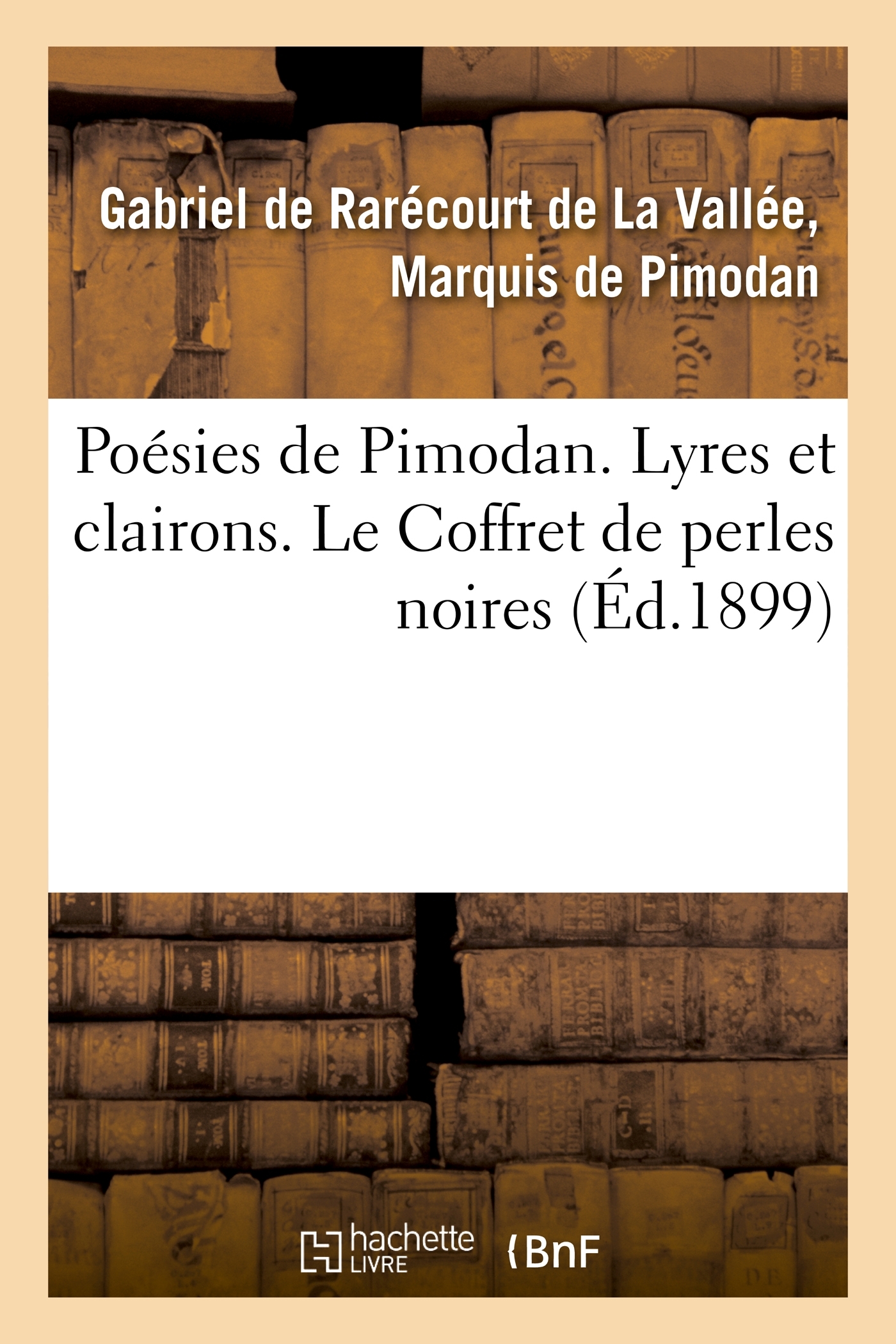 Poésies de Pimodan. Lyres et clairons. Le Coffret de perles noires... Date de l'édition originale : 1899 Le présent ouvrage s'inscrit dans une politique de conservation patrimoniale des ouvrages de la littérature Française mise en place avec la BNF. HACHETTE LIVRE et la BNF proposent ainsi un catalogue de titres indisponibles, la BNF ayant numérisé ces œuvres et HACHETTE LIVRE les imprimant à la demande. Certains de ces ouvrages reflètent des courants de pensée caractéristiques de leur époque, mais qui seraient aujourd'hui jugés condamnables. Ils n'en appartiennent pas moins à l'histoire des idées en France et sont susceptibles de présenter un intérêt scientifique ou historique. Le sens de notre démarche éditoriale consiste ainsi à permettre l'accès à ces œuvres sans pour autant que nous en cautionnions en aucune façon le contenu. Pour plus d'informations, rendez-vous sur www.hachettebnf.fr
