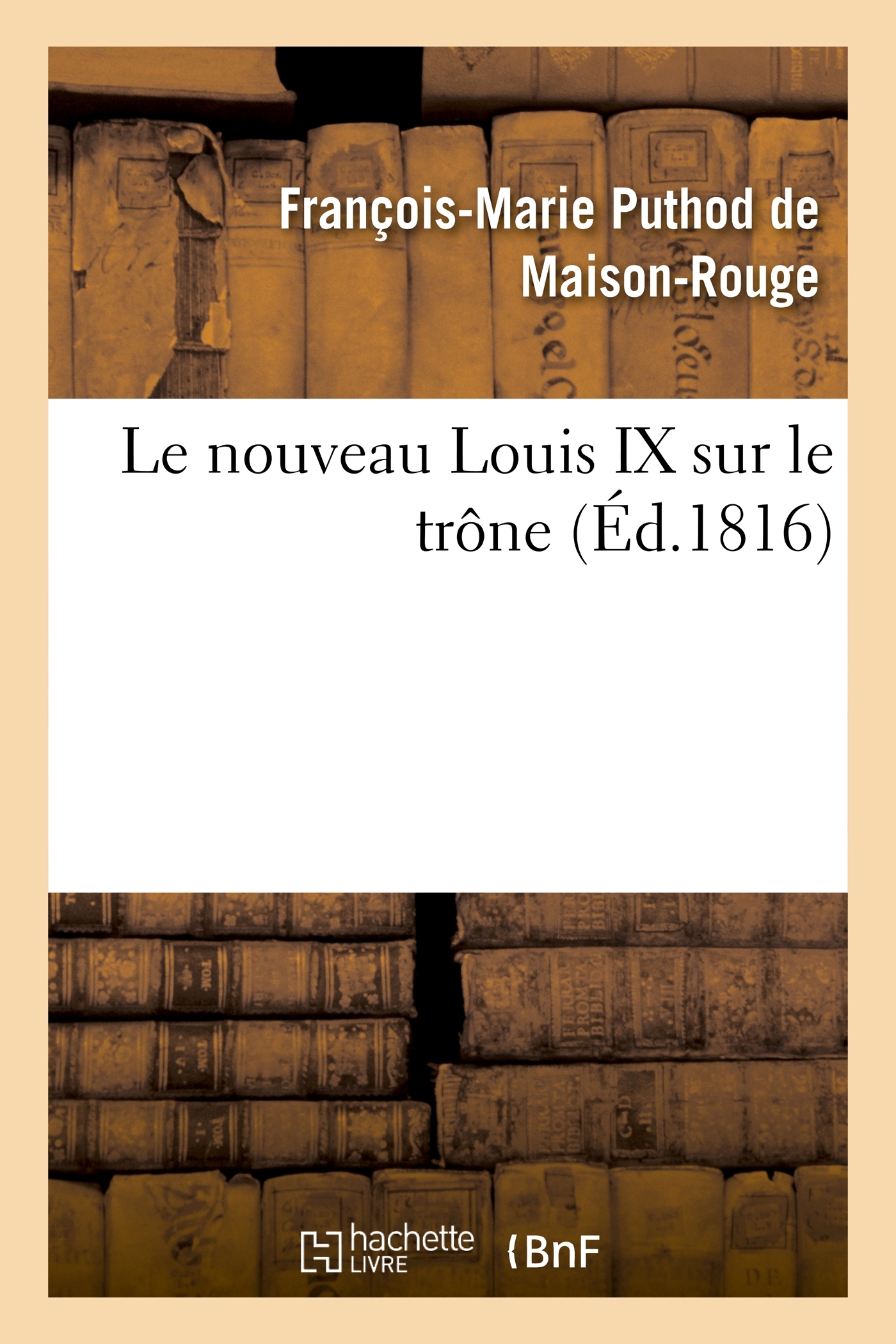 Le nouveau Louis IX sur le trône Date de l'édition originale : 1816 Sujet de l'ouvrage : France (1814-1824, Louis XVIII) Le présent ouvrage s'inscrit dans une politique de conservation patrimoniale des ouvrages de la littérature Française mise en place avec la BNF. HACHETTE LIVRE et la BNF proposent ainsi un catalogue de titres indisponibles, la BNF ayant numérisé ces œuvres et HACHETTE LIVRE les imprimant à la demande. Certains de ces ouvrages reflètent des courants de pensée caractéristiques de leur époque, mais qui seraient aujourd'hui jugés condamnables. Ils n'en appartiennent pas moins à l'histoire des idées en France et sont susceptibles de présenter un intérêt scientifique ou historique. Le sens de notre démarche éditoriale consiste ainsi à permettre l'accès à ces œuvres sans pour autant que nous en cautionnions en aucune façon le contenu. Pour plus d'informations, rendez-vous sur www.hachettebnf.fr