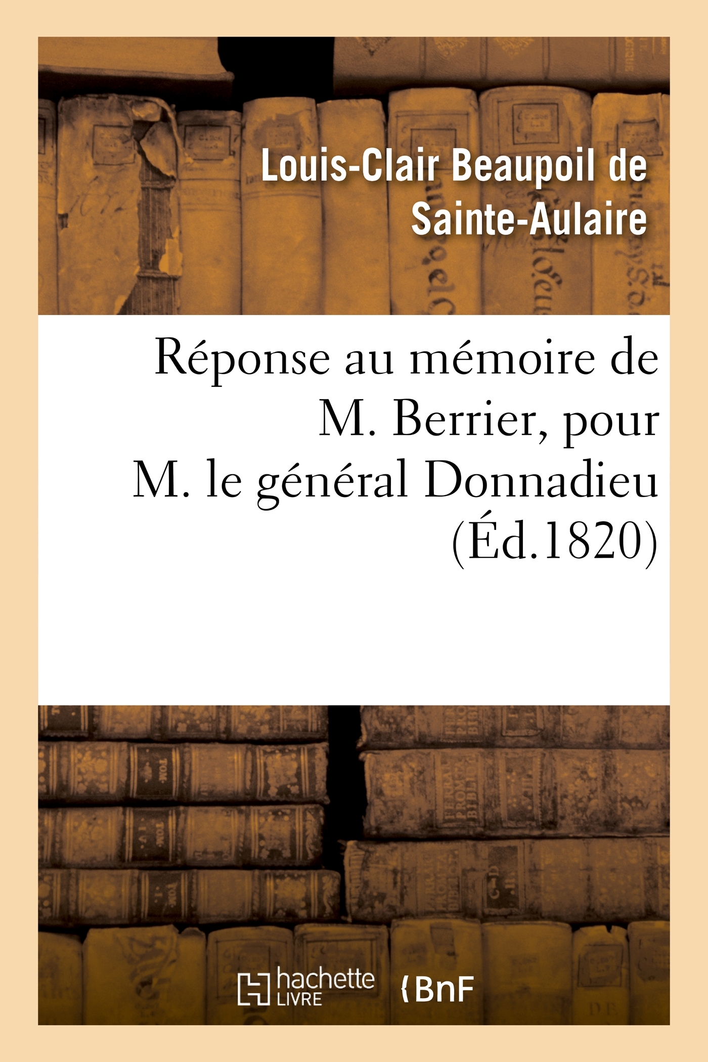 Réponse au mémoire de M. Berrier, pour M. le général Donnadieu, par M. le Cte de Ste-Aulaire... Date de l'édition originale : 1820 Le présent ouvrage s'inscrit dans une politique de conservation patrimoniale des ouvrages de la littérature Française mise en place avec la BNF. HACHETTE LIVRE et la BNF proposent ainsi un catalogue de titres indisponibles, la BNF ayant numérisé ces œuvres et HACHETTE LIVRE les imprimant à la demande. Certains de ces ouvrages reflètent des courants de pensée caractéristiques de leur époque, mais qui seraient aujourd'hui jugés condamnables. Ils n'en appartiennent pas moins à l'histoire des idées en France et sont susceptibles de présenter un intérêt scientifique ou historique. Le sens de notre démarche éditoriale consiste ainsi à permettre l'accès à ces œuvres sans pour autant que nous en cautionnions en aucune façon le contenu. Pour plus d'informations, rendez-vous sur www.hachettebnf.fr