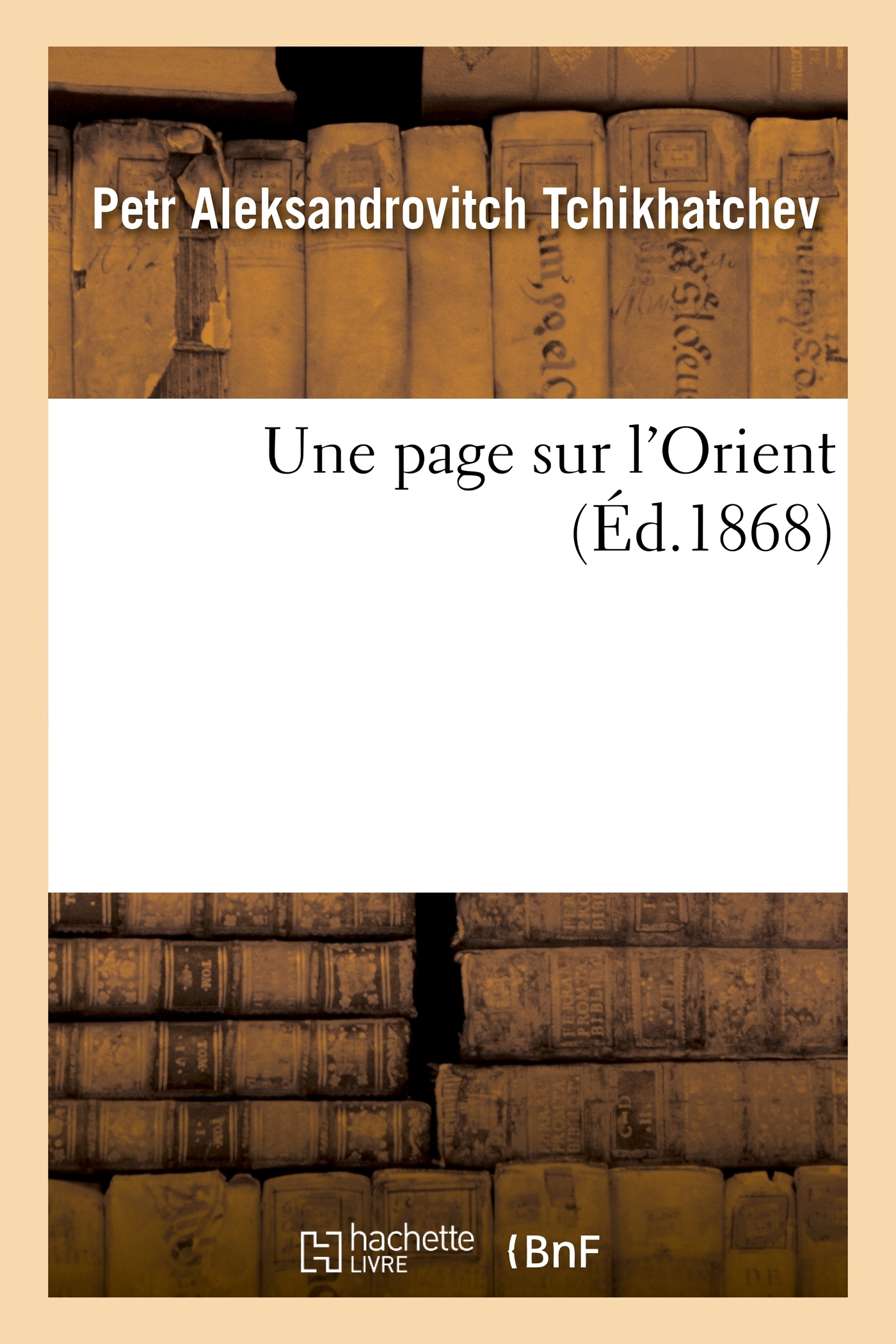Une page sur l'Orient [l'Asie mineure], par P. de Tchihatchef,... Date de l'édition originale : 1868 Le présent ouvrage s'inscrit dans une politique de conservation patrimoniale des ouvrages de la littérature Française mise en place avec la BNF. HACHETTE LIVRE et la BNF proposent ainsi un catalogue de titres indisponibles, la BNF ayant numérisé ces œuvres et HACHETTE LIVRE les imprimant à la demande. Certains de ces ouvrages reflètent des courants de pensée caractéristiques de leur époque, mais qui seraient aujourd'hui jugés condamnables. Ils n'en appartiennent pas moins à l'histoire des idées en France et sont susceptibles de présenter un intérêt scientifique ou historique. Le sens de notre démarche éditoriale consiste ainsi à permettre l'accès à ces œuvres sans pour autant que nous en cautionnions en aucune façon le contenu. Pour plus d'informations, rendez-vous sur www.hachettebnf.fr