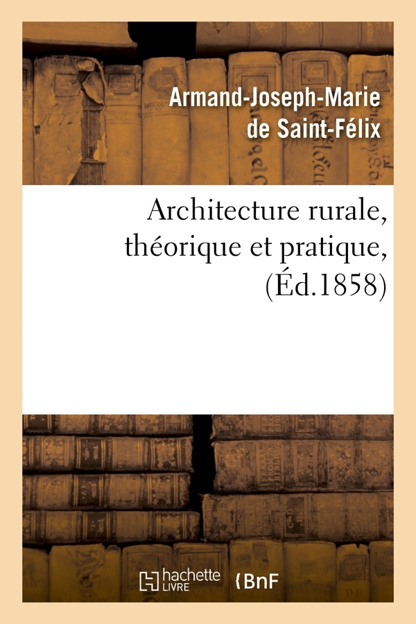 Architecture rurale, théorique et pratique, à l'usage des propriétaires et des ouvriers de la campagne, par A.-J.-M. de Saint-Félix, Mis de Mauremont, Cte de Cajarc,... 3e édition... Date de l'édition originale : 1858 Le présent ouvrage s'inscrit dans une politique de conservation patrimoniale des ouvrages de la littérature Française mise en place avec la BNF. HACHETTE LIVRE et la BNF proposent ainsi un catalogue de titres indisponibles, la BNF ayant numérisé ces œuvres et HACHETTE LIVRE les imprimant à la demande. Certains de ces ouvrages reflètent des courants de pensée caractéristiques de leur époque, mais qui seraient aujourd'hui jugés condamnables. Ils n'en appartiennent pas moins à l'histoire des idées en France et sont susceptibles de présenter un intérêt scientifique ou historique. Le sens de notre démarche éditoriale consiste ainsi à permettre l'accès à ces œuvres sans pour autant que nous en cautionnions en aucune façon le contenu. Pour plus d'informations, rendez-vous sur www.hachettebnf.fr