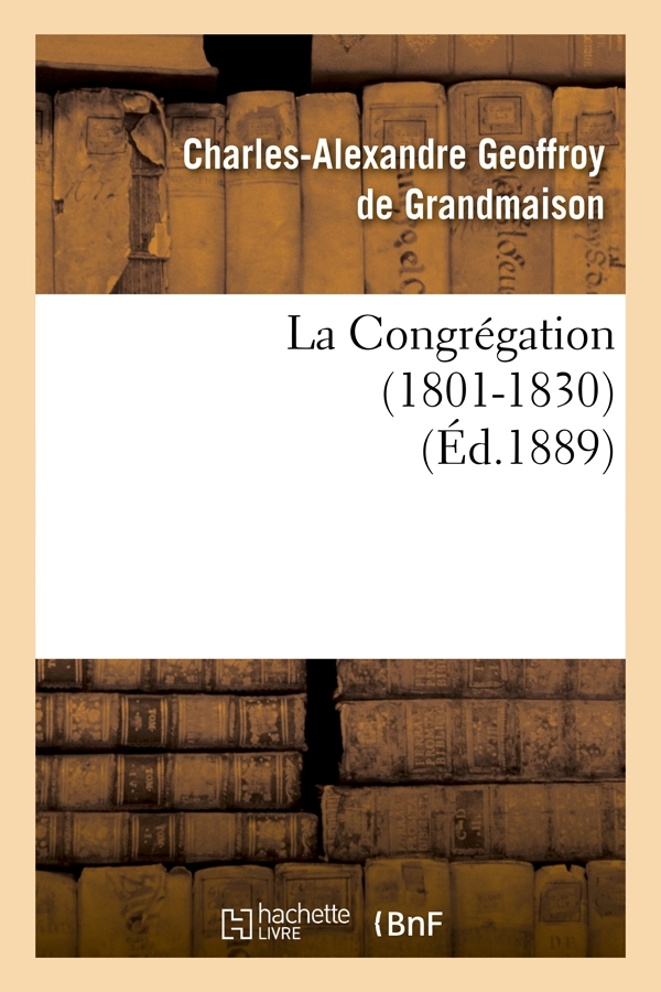 La Congrégation (1801-1830) / par M. Geoffroy de Grandmaison ; préface par M. le Cte Albert de Mun Date de l'édition originale : 1889 Sujet de l'ouvrage : Congrégation Le présent ouvrage s'inscrit dans une politique de conservation patrimoniale des ouvrages de la littérature Française mise en place avec la BNF. HACHETTE LIVRE et la BNF proposent ainsi un catalogue de titres indisponibles, la BNF ayant numérisé ces œuvres et HACHETTE LIVRE les imprimant à la demande. Certains de ces ouvrages reflètent des courants de pensée caractéristiques de leur époque, mais qui seraient aujourd'hui jugés condamnables. Ils n'en appartiennent pas moins à l'histoire des idées en France et sont susceptibles de présenter un intérêt scientifique ou historique. Le sens de notre démarche éditoriale consiste ainsi à permettre l'accès à ces œuvres sans pour autant que nous en cautionnions en aucune façon le contenu. Pour plus d'informations, rendez-vous sur www.hachettebnf.fr