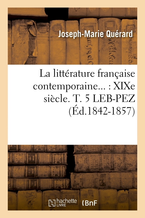 La littérature française contemporaine... : XIXe siècle. T. 5 LEB-PEZ / par J.-M. Quérard [puis] MM. Charles Louandre et Félix Bourquelot Date de l'édition originale : 1842-1857 Sujet de l'ouvrage : Littérature française -- 19e siècle -- Dictionnaires Le présent ouvrage s'inscrit dans une politique de conservation patrimoniale des ouvrages de la littérature Française mise en place avec la BNF. HACHETTE LIVRE et la BNF proposent ainsi un catalogue de titres indisponibles, la BNF ayant numérisé ces œuvres et HACHETTE LIVRE les imprimant à la demande. Certains de ces ouvrages reflètent des courants de pensée caractéristiques de leur époque, mais qui seraient aujourd'hui jugés condamnables. Ils n'en appartiennent pas moins à l'histoire des idées en France et sont susceptibles de présenter un intérêt scientifique ou historique. Le sens de notre démarche éditoriale consiste ainsi à permettre l'accès à ces œuvres sans pour autant que nous en cautionnions en aucune façon le contenu. Pour plus d'informations, rendez-vous sur www.hachettebnf.fr