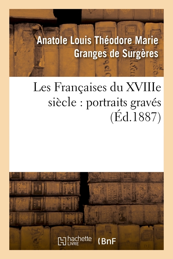 Les Françaises du XVIIIe siècle : portraits gravés / par le marquis de Granges de Surgères et Gustave Bourcard ; avec une préface de M. le baron Roger Portalis,... Date de l'édition originale : 1887 Sujet de l'ouvrage : Portraits -- France -- 18e siècleFemmes -- France -- Biographies Le présent ouvrage s'inscrit dans une politique de conservation patrimoniale des ouvrages de la littérature Française mise en place avec la BNF. HACHETTE LIVRE et la BNF proposent ainsi un catalogue de titres indisponibles, la BNF ayant numérisé ces œuvres et HACHETTE LIVRE les imprimant à la demande. Certains de ces ouvrages reflètent des courants de pensée caractéristiques de leur époque, mais qui seraient aujourd'hui jugés condamnables. Ils n'en appartiennent pas moins à l'histoire des idées en France et sont susceptibles de présenter un intérêt scientifique ou historique. Le sens de notre démarche éditoriale consiste ainsi à permettre l'accès à ces œuvres sans pour autant que nous en cautionnions en aucune façon le contenu. Pour plus d'informations, rendez-vous sur www.hachettebnf.fr