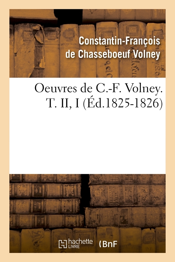 Oeuvres de C.-F. Volney. T. II, I Date de l'édition originale : 1825-1826 Le présent ouvrage s'inscrit dans une politique de conservation patrimoniale des ouvrages de la littérature Française mise en place avec la BNF. HACHETTE LIVRE et la BNF proposent ainsi un catalogue de titres indisponibles, la BNF ayant numérisé ces œuvres et HACHETTE LIVRE les imprimant à la demande. Certains de ces ouvrages reflètent des courants de pensée caractéristiques de leur époque, mais qui seraient aujourd'hui jugés condamnables. Ils n'en appartiennent pas moins à l'histoire des idées en France et sont susceptibles de présenter un intérêt scientifique ou historique. Le sens de notre démarche éditoriale consiste ainsi à permettre l'accès à ces œuvres sans pour autant que nous en cautionnions en aucune façon le contenu. Pour plus d'informations, rendez-vous sur www.hachettebnf.fr