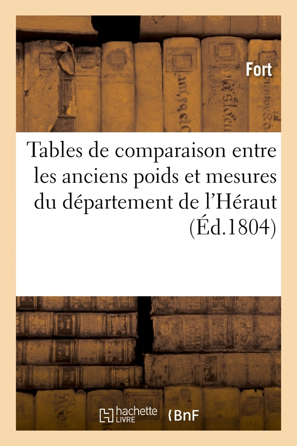 Tables de comparaison entre les anciens poids et mesures du département de l'Héraut et les nouveaux poids et mesures ... par M. Fort aîné, de St-Pons,... Date de l'édition originale : 1804 Le présent ouvrage s'inscrit dans une politique de conservation patrimoniale des ouvrages de la littérature Française mise en place avec la BNF. HACHETTE LIVRE et la BNF proposent ainsi un catalogue de titres indisponibles, la BNF ayant numérisé ces œuvres et HACHETTE LIVRE les imprimant à la demande. Certains de ces ouvrages reflètent des courants de pensée caractéristiques de leur époque, mais qui seraient aujourd'hui jugés condamnables. Ils n'en appartiennent pas moins à l'histoire des idées en France et sont susceptibles de présenter un intérêt scientifique ou historique. Le sens de notre démarche éditoriale consiste ainsi à permettre l'accès à ces œuvres sans pour autant que nous en cautionnions en aucune façon le contenu. Pour plus d'informations, rendez-vous sur www.hachettebnf.fr