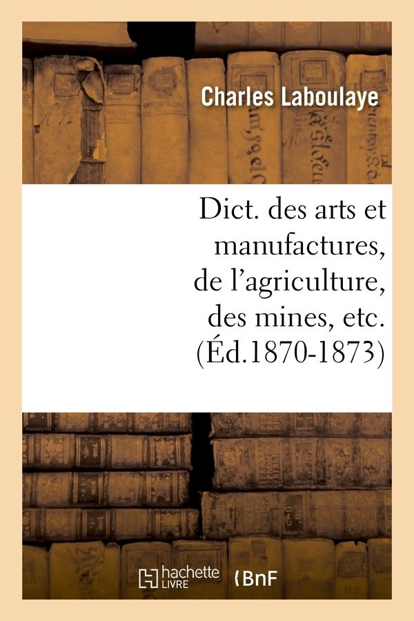 Dictionnaire des arts et manufactures, de l'agriculture, des mines, etc. : description des procédés de l'industrie française et étrangère. Complément / par M. Ch. Laboulaye,... Date de l'édition originale : 1870-1873 Sujet de l'ouvrage : Technologie -- Dictionnaires -- 19e siècleAppareils et instruments scientifiques -- Fabrication -- Dictionnaires -- 19e siècle Le présent ouvrage s'inscrit dans une politique de conservation patrimoniale des ouvrages de la littérature Française mise en place avec la BNF. HACHETTE LIVRE et la BNF proposent ainsi un catalogue de titres indisponibles, la BNF ayant numérisé ces œuvres et HACHETTE LIVRE les imprimant à la demande. Certains de ces ouvrages reflètent des courants de pensée caractéristiques de leur époque, mais qui seraient aujourd'hui jugés condamnables. Ils n'en appartiennent pas moins à l'histoire des idées en France et sont susceptibles de présenter un intérêt scientifique ou historique. Le sens de notre démarche éditoriale consiste ainsi à permettre l'accès à ces œuvres sans pour autant que nous en cautionnions en aucune façon le contenu. Pour plus d'informations, rendez-vous sur www.hachettebnf.fr