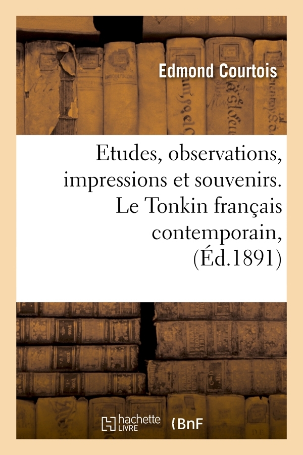 Le Tonkin français contemporain : études, observations, impressions et souvenirs / par le Dr Edmond Courtois,... Date de l'édition originale : 1891 Sujet de l'ouvrage : TonkinFrance -- Colonies -- Histoire Le présent ouvrage s'inscrit dans une politique de conservation patrimoniale des ouvrages de la littérature Française mise en place avec la BNF. HACHETTE LIVRE et la BNF proposent ainsi un catalogue de titres indisponibles, la BNF ayant numérisé ces œuvres et HACHETTE LIVRE les imprimant à la demande. Certains de ces ouvrages reflètent des courants de pensée caractéristiques de leur époque, mais qui seraient aujourd'hui jugés condamnables. Ils n'en appartiennent pas moins à l'histoire des idées en France et sont susceptibles de présenter un intérêt scientifique ou historique. Le sens de notre démarche éditoriale consiste ainsi à permettre l'accès à ces œuvres sans pour autant que nous en cautionnions en aucune façon le contenu. Pour plus d'informations, rendez-vous sur www.hachettebnf.fr