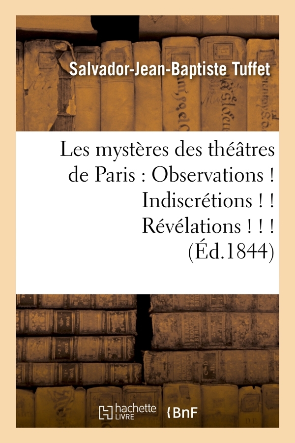 Les mystères des théâtres de Paris : Observations ! Indiscrétions ! ! Révélations ! ! ! (Édition illustrée du portrait de l'auteur et de vignettes sur bois) / par un vieux comparse Date de l'édition originale : 1844 Le présent ouvrage s'inscrit dans une politique de conservation patrimoniale des ouvrages de la littérature Française mise en place avec la BNF. HACHETTE LIVRE et la BNF proposent ainsi un catalogue de titres indisponibles, la BNF ayant numérisé ces œuvres et HACHETTE LIVRE les imprimant à la demande. Certains de ces ouvrages reflètent des courants de pensée caractéristiques de leur époque, mais qui seraient aujourd'hui jugés condamnables. Ils n'en appartiennent pas moins à l'histoire des idées en France et sont susceptibles de présenter un intérêt scientifique ou historique. Le sens de notre démarche éditoriale consiste ainsi à permettre l'accès à ces œuvres sans pour autant que nous en cautionnions en aucune façon le contenu. Pour plus d'informations, rendez-vous sur www.hachettebnf.fr