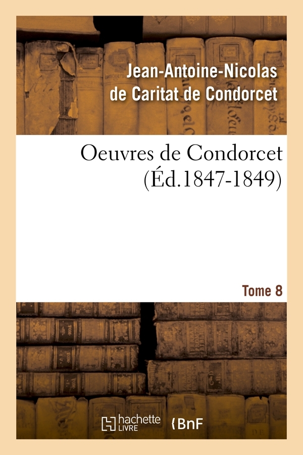 Oeuvres de Condorcet. Tome 8 / publiées par A. Condorcet, O' Conor,... F. Arago, F. Génin et Isambert Date de l'édition originale : 1847-1849 Le présent ouvrage s'inscrit dans une politique de conservation patrimoniale des ouvrages de la littérature Française mise en place avec la BNF. HACHETTE LIVRE et la BNF proposent ainsi un catalogue de titres indisponibles, la BNF ayant numérisé ces œuvres et HACHETTE LIVRE les imprimant à la demande. Certains de ces ouvrages reflètent des courants de pensée caractéristiques de leur époque, mais qui seraient aujourd'hui jugés condamnables. Ils n'en appartiennent pas moins à l'histoire des idées en France et sont susceptibles de présenter un intérêt scientifique ou historique. Le sens de notre démarche éditoriale consiste ainsi à permettre l'accès à ces œuvres sans pour autant que nous en cautionnions en aucune façon le contenu. Pour plus d'informations, rendez-vous sur www.hachettebnf.fr
