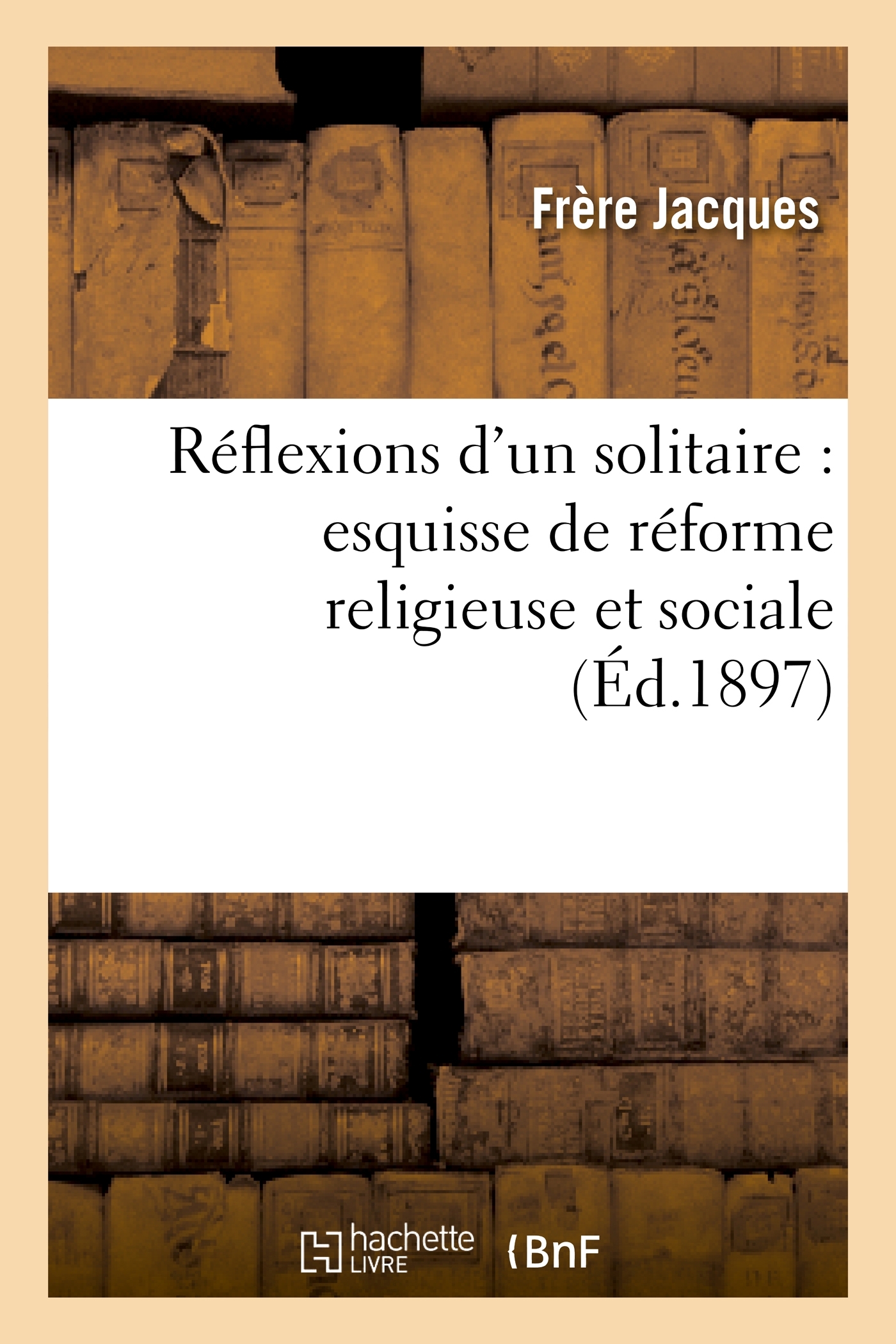 Réflexions d'un solitaire : esquisse de réforme religieuse et sociale / par Frère Jacques Date de l'édition originale : 1897 Le présent ouvrage s'inscrit dans une politique de conservation patrimoniale des ouvrages de la littérature Française mise en place avec la BNF. HACHETTE LIVRE et la BNF proposent ainsi un catalogue de titres indisponibles, la BNF ayant numérisé ces œuvres et HACHETTE LIVRE les imprimant à la demande. Certains de ces ouvrages reflètent des courants de pensée caractéristiques de leur époque, mais qui seraient aujourd'hui jugés condamnables. Ils n'en appartiennent pas moins à l'histoire des idées en France et sont susceptibles de présenter un intérêt scientifique ou historique. Le sens de notre démarche éditoriale consiste ainsi à permettre l'accès à ces œuvres sans pour autant que nous en cautionnions en aucune façon le contenu. Pour plus d'informations, rendez-vous sur www.hachettebnf.fr