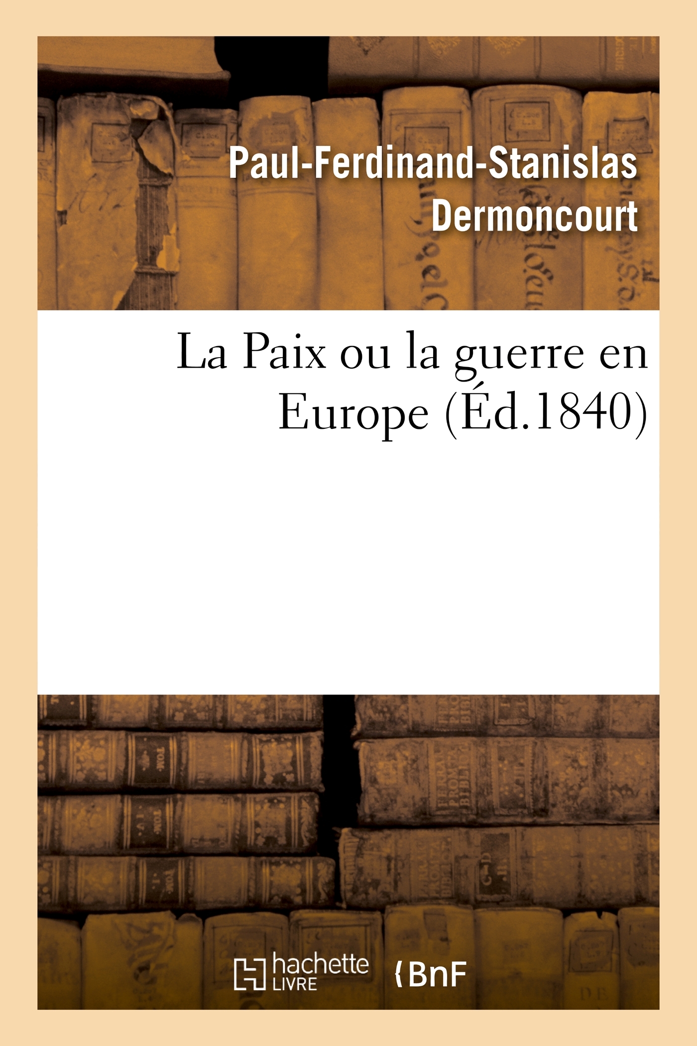 La Paix ou la guerre en Europe, par le Gal Bon Dermoncourt, suivi d'une proposition faite aux comités d'infanterie et de cavalerie près le ministre de la Guerre de nouveaux modèles d'effets d'habillement, d'équipement, de coiffure et d'un havresac... [Par M. Dufaure (de Montmirail).] Date de l'édition originale : 1840 Comprend : Proposition faite aux comités d'infanterie et de cavalerie près le ministre de la guerre de nouveaux modèles d'effets d'habillement, d'équipement... et d'un havre-sac Le présent ouvrage s'inscrit dans une politique de conservation patrimoniale des ouvrages de la littérature Française mise en place avec la BNF. HACHETTE LIVRE et la BNF proposent ainsi un catalogue de titres indisponibles, la BNF ayant numérisé ces œuvres et HACHETTE LIVRE les imprimant à la demande. Certains de ces ouvrages reflètent des courants de pensée caractéristiques de leur époque, mais qui seraient aujourd'hui jugés condamnables. Ils n'en appartiennent pas moins à l'histoire des idées en France et sont susceptibles de présenter un intérêt scientifique ou historique. Le sens de notre démarche éditoriale consiste ainsi à permettre l'accès à ces œuvres sans pour autant que nous en cautionnions en aucune façon le contenu. Pour plus d'informations, rendez-vous sur www.hachettebnf.fr
