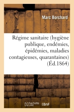 Du Régime sanitaire (hygiène publique, endémies, épidémies, maladies contagieuses, quarantaines, en France et dans les pays étrangers), par M. Borchard,... Date de l'édition originale : 1864 Le présent ouvrage s'inscrit dans une politique de conservation patrimoniale des ouvrages de la littérature Française mise en place avec la BNF. HACHETTE LIVRE et la BNF proposent ainsi un catalogue de titres indisponibles, la BNF ayant numérisé ces œuvres et HACHETTE LIVRE les imprimant à la demande. Certains de ces ouvrages reflètent des courants de pensée caractéristiques de leur époque, mais qui seraient aujourd'hui jugés condamnables. Ils n'en appartiennent pas moins à l'histoire des idées en France et sont susceptibles de présenter un intérêt scientifique ou historique. Le sens de notre démarche éditoriale consiste ainsi à permettre l'accès à ces œuvres sans pour autant que nous en cautionnions en aucune façon le contenu. Pour plus d'informations, rendez-vous sur www.hachettebnf.fr