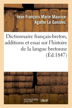 Dictionnaire français-breton de Le Gonidec, enrichi d'additions et d'un Essai sur l'histoire de la langue bretonne / par Th. Hersart de La Villemarqué Date de l'édition originale : 1847 Sujet de l'ouvrage : Français (langue) -- Dictionnaires bretons Appartient à l'ensemble documentaire : Bretagn1 Le présent ouvrage s'inscrit dans une politique de conservation patrimoniale des ouvrages de la littérature Française mise en place avec la BNF. HACHETTE LIVRE et la BNF proposent ainsi un catalogue de titres indisponibles, la BNF ayant numérisé ces œuvres et HACHETTE LIVRE les imprimant à la demande. Certains de ces ouvrages reflètent des courants de pensée caractéristiques de leur époque, mais qui seraient aujourd'hui jugés condamnables. Ils n'en appartiennent pas moins à l'histoire des idées en France et sont susceptibles de présenter un intérêt scientifique ou historique. Le sens de notre démarche éditoriale consiste ainsi à permettre l'accès à ces œuvres sans pour autant que nous en cautionnions en aucune façon le contenu. Pour plus d'informations, rendez-vous sur www.hachettebnf.fr