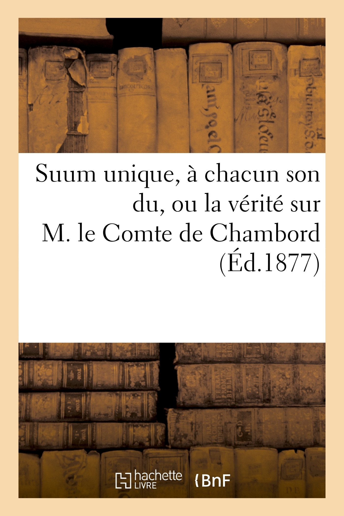 Suum unique, à chacun son du, ou la vérité sur M. le Cte de Chambord ; notions élémentaires de l'histoire contemporaine de France par Aug. de C. de La Gautraye. 3e édition... Date de l'édition originale : 1877 Sujet de l'ouvrage : France (1870-1940, 3e République) Le présent ouvrage s'inscrit dans une politique de conservation patrimoniale des ouvrages de la littérature Française mise en place avec la BNF. HACHETTE LIVRE et la BNF proposent ainsi un catalogue de titres indisponibles, la BNF ayant numérisé ces œuvres et HACHETTE LIVRE les imprimant à la demande. Certains de ces ouvrages reflètent des courants de pensée caractéristiques de leur époque, mais qui seraient aujourd'hui jugés condamnables. Ils n'en appartiennent pas moins à l'histoire des idées en France et sont susceptibles de présenter un intérêt scientifique ou historique. Le sens de notre démarche éditoriale consiste ainsi à permettre l'accès à ces œuvres sans pour autant que nous en cautionnions en aucune façon le contenu. Pour plus d'informations, rendez-vous sur www.hachettebnf.fr