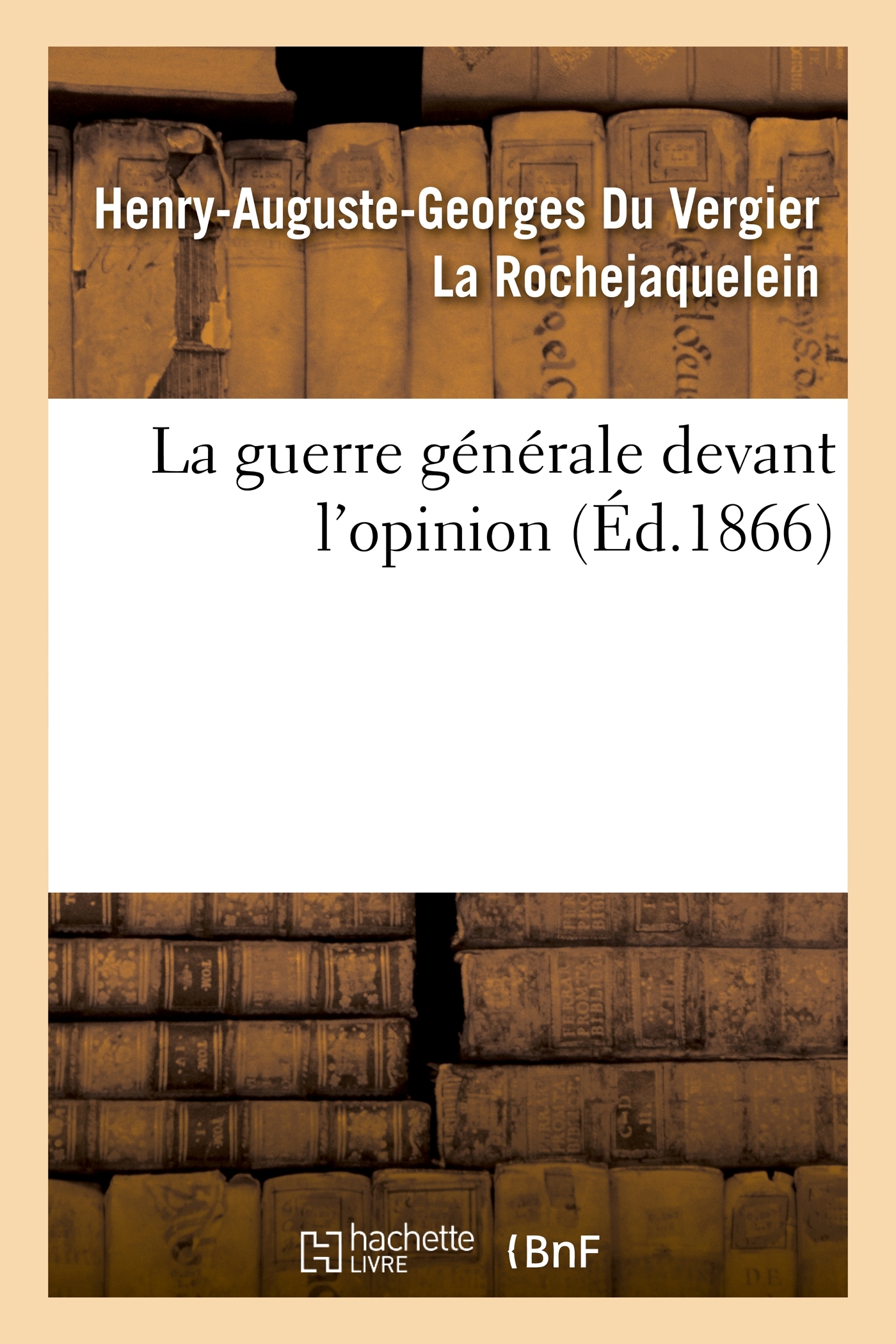 La guerre générale devant l'opinion / par le Mis de La Rochejaquelein,... Date de l'édition originale : 1866 Le présent ouvrage s'inscrit dans une politique de conservation patrimoniale des ouvrages de la littérature Française mise en place avec la BNF. HACHETTE LIVRE et la BNF proposent ainsi un catalogue de titres indisponibles, la BNF ayant numérisé ces œuvres et HACHETTE LIVRE les imprimant à la demande. Certains de ces ouvrages reflètent des courants de pensée caractéristiques de leur époque, mais qui seraient aujourd'hui jugés condamnables. Ils n'en appartiennent pas moins à l'histoire des idées en France et sont susceptibles de présenter un intérêt scientifique ou historique. Le sens de notre démarche éditoriale consiste ainsi à permettre l'accès à ces œuvres sans pour autant que nous en cautionnions en aucune façon le contenu. Pour plus d'informations, rendez-vous sur www.hachettebnf.fr