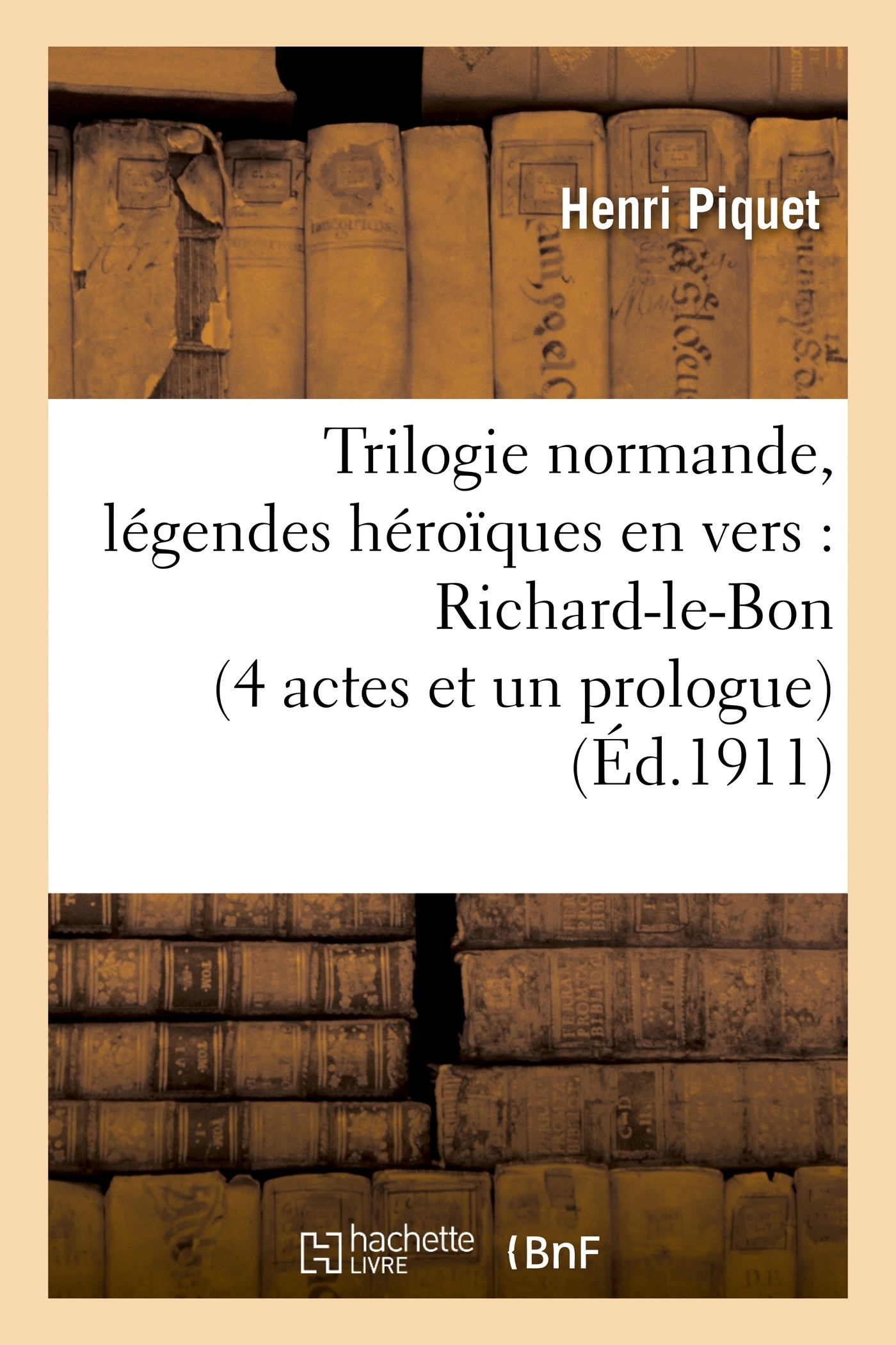 Trilogie normande, légendes héroïques en vers : Richard-le-Bon (4 actes et un prologue), Robert-le-Diable (5 actes et 6 tableaux), Guillaume-le-Bâtard (7 actes et 8 tableaux) / Henri Piquet. Le présent ouvrage s'inscrit dans une politique de conservation patrimoniale des ouvrages de la littérature Française mise en place avec la BNF. HACHETTE LIVRE et la BNF proposent ainsi un catalogue de titres indisponibles, la BNF ayant numérisé ces oeuvres et HACHETTE LIVRE les imprimant à la demande. Certains de ces ouvrages reflètent des courants de pensée caractéristiques de leur époque, mais qui seraient aujourd'hui jugés condamnables. Ils n'en appartiennent pas moins à l'histoire des idées en France et sont susceptibles de présenter un intérêt scientifique ou historique. Le sens de notre démarche éditoriale consiste ainsi à permettre l'accès à ces oeuvres sans pour autant que nous en cautionnions en aucune façon le contenu. Pour plus d'informations, rendez-vous sur www.hachettebnf.fr