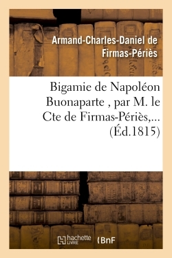 Bigamie de Napoléon Buonaparte , par M. le Cte de Firmas-Périès,... Date de l'édition originale : 1815 Le présent ouvrage s'inscrit dans une politique de conservation patrimoniale des ouvrages de la littérature Française mise en place avec la BNF. HACHETTE LIVRE et la BNF proposent ainsi un catalogue de titres indisponibles, la BNF ayant numérisé ces œuvres et HACHETTE LIVRE les imprimant à la demande. Certains de ces ouvrages reflètent des courants de pensée caractéristiques de leur époque, mais qui seraient aujourd'hui jugés condamnables. Ils n'en appartiennent pas moins à l'histoire des idées en France et sont susceptibles de présenter un intérêt scientifique ou historique. Le sens de notre démarche éditoriale consiste ainsi à permettre l'accès à ces œuvres sans pour autant que nous en cautionnions en aucune façon le contenu. Pour plus d'informations, rendez-vous sur www.hachettebnf.fr