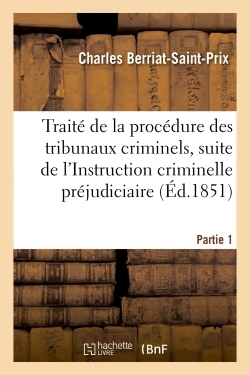 Traité de la procédure des tribunaux criminels : suite de l'Instruction criminelle préjudiciaire. PART1 / par Ch. Berriat-Saint-Prix... Date de l'édition originale : 1851-1854 Le présent ouvrage s'inscrit dans une politique de conservation patrimoniale des ouvrages de la littérature Française mise en place avec la BNF. HACHETTE LIVRE et la BNF proposent ainsi un catalogue de titres indisponibles, la BNF ayant numérisé ces œuvres et HACHETTE LIVRE les imprimant à la demande. Certains de ces ouvrages reflètent des courants de pensée caractéristiques de leur époque, mais qui seraient aujourd'hui jugés condamnables. Ils n'en appartiennent pas moins à l'histoire des idées en France et sont susceptibles de présenter un intérêt scientifique ou historique. Le sens de notre démarche éditoriale consiste ainsi à permettre l'accès à ces œuvres sans pour autant que nous en cautionnions en aucune façon le contenu. Pour plus d'informations, rendez-vous sur www.hachettebnf.fr