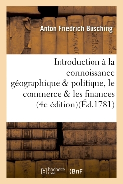 Introduction à la connoissance géographique et politique, le commerce et les finances, des états de l'Europe . Par Ant. Fréd. Busching,... traduit de l'allemand d'après la cinquième édition. 4e édition... Date de l'édition originale : 1781 Le présent ouvrage s'inscrit dans une politique de conservation patrimoniale des ouvrages de la littérature Française mise en place avec la BNF. HACHETTE LIVRE et la BNF proposent ainsi un catalogue de titres indisponibles, la BNF ayant numérisé ces œuvres et HACHETTE LIVRE les imprimant à la demande. Certains de ces ouvrages reflètent des courants de pensée caractéristiques de leur époque, mais qui seraient aujourd'hui jugés condamnables. Ils n'en appartiennent pas moins à l'histoire des idées en France et sont susceptibles de présenter un intérêt scientifique ou historique. Le sens de notre démarche éditoriale consiste ainsi à permettre l'accès à ces œuvres sans pour autant que nous en cautionnions en aucune façon le contenu. Pour plus d'informations, rendez-vous sur www.hachettebnf.fr