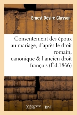 Du consentement des époux au mariage : d'après le droit romain, le droit canonique, l'ancien droit français... / par E. Glasson,... Date de l'édition originale : 1866 Le présent ouvrage s'inscrit dans une politique de conservation patrimoniale des ouvrages de la littérature Française mise en place avec la BNF. HACHETTE LIVRE et la BNF proposent ainsi un catalogue de titres indisponibles, la BNF ayant numérisé ces œuvres et HACHETTE LIVRE les imprimant à la demande. Certains de ces ouvrages reflètent des courants de pensée caractéristiques de leur époque, mais qui seraient aujourd'hui jugés condamnables. Ils n'en appartiennent pas moins à l'histoire des idées en France et sont susceptibles de présenter un intérêt scientifique ou historique. Le sens de notre démarche éditoriale consiste ainsi à permettre l'accès à cesœuvres sans pour autant que nous en cautionnions en aucune façon le contenu. Pour plus d'informations, rendez-vous sur www.hachettebnf.fr