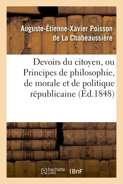 Devoirs du citoyen, ou Principes de philosophie, de morale et de politique républicaine : suivi de Chants et hymnes républicains / par La Chabeaussière Date de l'édition originale : 1848 Le présent ouvrage s'inscrit dans une politique de conservation patrimoniale des ouvrages de la littérature Française mise en place avec la BNF. HACHETTE LIVRE et la BNF proposent ainsi un catalogue de titres indisponibles, la BNF ayant numérisé ces œuvres et HACHETTE LIVRE les imprimant à la demande. Certains de ces ouvrages reflètent des courants de pensée caractéristiques de leur époque, mais qui seraient aujourd'hui jugés condamnables. Ils n'en appartiennent pas moins à l'histoire des idées en France et sont susceptibles de présenter un intérêt scientifique ou historique. Le sens de notre démarche éditoriale consiste ainsi à permettre l'accès à ces œuvres sans pour autant que nous en cautionnions en aucune façon le contenu. Pour plus d'informations, rendez-vous sur www.hachettebnf.fr