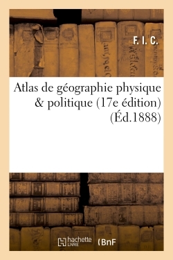 Atlas de géographie physique & politique (17e édition) / par F. I. C.... Date de l'édition originale : 1888 Le présent ouvrage s'inscrit dans une politique de conservation patrimoniale des ouvrages de la littérature Française mise en place avec la BNF. HACHETTE LIVRE et la BNF proposent ainsi un catalogue de titres indisponibles, la BNF ayant numérisé ces œuvres et HACHETTE LIVRE les imprimant à la demande. Certains de ces ouvrages reflètent des courants de pensée caractéristiques de leur époque, mais qui seraient aujourd'hui jugés condamnables. Ils n'en appartiennent pas moins à l'histoire des idées en France et sont susceptibles de présenter un intérêt scientifique ou historique. Le sens de notre démarche éditoriale consiste ainsi à permettre l'accès à ces œuvres sans pour autant que nous en cautionnions en aucune façon le contenu. Pour plus d'informations, rendez-vous sur www.hachettebnf.fr