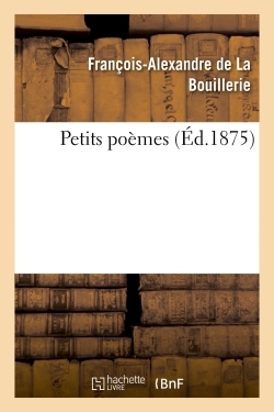 Petits poèmes de Mgr de La Bouillerie / publiés avec préface et réflexions, par un de ses disciples [E. Boyer] Date de l'édition originale : 1875 Le présent ouvrage s'inscrit dans une politique de conservation patrimoniale des ouvrages de la littérature Française mise en place avec la BNF. HACHETTE LIVRE et la BNF proposent ainsi un catalogue de titres indisponibles, la BNF ayant numérisé ces œuvres et HACHETTE LIVRE les imprimant à la demande. Certains de ces ouvrages reflètent des courants de pensée caractéristiques de leur époque, mais qui seraient aujourd'hui jugés condamnables. Ils n'en appartiennent pas moins à l'histoire des idées en France et sont susceptibles de présenter un intérêt scientifique ou historique. Le sens de notre démarche éditoriale consiste ainsi à permettre l'accès à ces œuvres sans pour autant que nous en cautionnions en aucune façon le contenu. Pour plus d'informations, rendez-vous sur www.hachettebnf.fr