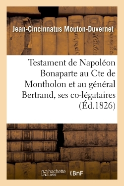 Testament de Napoléon Bonaparte . J.-C. Mouton-Duvernet, légataire de Napoléon, et fils du lieutenant-général condamné et mis à mort à Lyon, en 1815, au Cte de Montholon et au général Bertrand, ses co-légataires Date de l'édition originale : 1826 Le présent ouvrage s'inscrit dans une politique de conservation patrimoniale des ouvrages de la littérature Française mise en place avec la BNF. HACHETTE LIVRE et la BNF proposent ainsi un catalogue de titres indisponibles, la BNF ayant numérisé ces œuvres et HACHETTE LIVRE les imprimant à la demande. Certains de ces ouvrages reflètent des courants de pensée caractéristiques de leur époque, mais qui seraient aujourd'hui jugés condamnables. Ils n'en appartiennent pas moins à l'histoire des idées en France et sont susceptibles de présenter un intérêt scientifique ou historique. Le sens de notre démarche éditoriale consiste ainsi à permettre l'accès à ces œuvres sans pour autant que nous en cautionnions en aucune façon le contenu. Pour plus d'informations, rendez-vous sur www.hachettebnf.fr