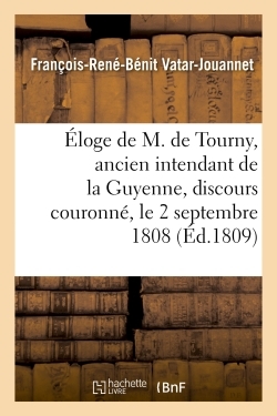 Éloge de M. de Tourny, ancien intendant de la Guyenne, discours couronné, le 2 septembre 1808, dans la séance publique de la Société des sciences et arts de Bordeaux, par F. J......t [Jouannet],... Date de l'édition originale : 1809 Appartient à l'ensemble documentaire : Aquit1 Le présent ouvrage s'inscrit dans une politique de conservation patrimoniale des ouvrages de la littérature Française mise en place avec la BNF. HACHETTE LIVRE et la BNF proposent ainsi un catalogue de titres indisponibles, la BNF ayant numérisé ces œuvres et HACHETTE LIVRE les imprimant à la demande. Certains de ces ouvrages reflètent des courants de pensée caractéristiques de leur époque, mais qui seraient aujourd'hui jugés condamnables. Ils n'en appartiennent pas moins à l'histoire des idées en France et sont susceptibles de présenter un intérêt scientifique ou historique. Le sens de notre démarche éditoriale consiste ainsi à permettre l'accès à ces œuvres sans pour autant que nous en cautionnions en aucune façon le contenu. Pour plus d'informations, rendez-vous sur www.hachettebnf.fr