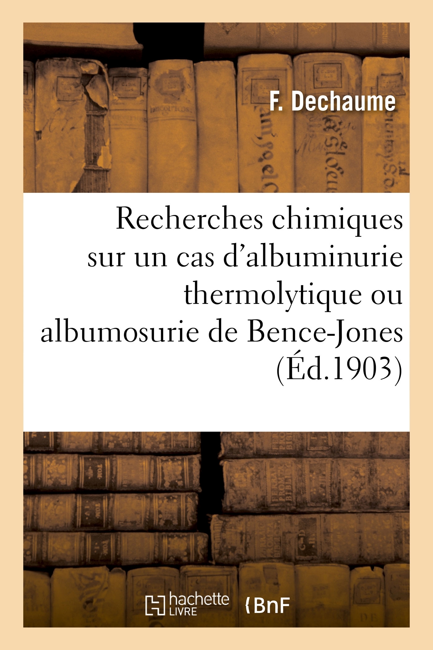 Recherches chimiques sur un cas d'albuminurie thermolytique ou albumosurie de Bence-Jones, par F. Dechaume,... Date de l'édition originale : 1903 Le présent ouvrage s'inscrit dans une politique de conservation patrimoniale des ouvrages de la littérature Française mise en place avec la BNF. HACHETTE LIVRE et la BNF proposent ainsi un catalogue de titres indisponibles, la BNF ayant numérisé ces oeuvres et HACHETTE LIVRE les imprimant à la demande. Certains de ces ouvrages reflètent des courants de pensée caractéristiques de leur époque, mais qui seraient aujourd'hui jugés condamnables. Ils n'en appartiennent pas moins à l'histoire des idées en France et sont susceptibles de présenter un intérêt scientifique ou historique. Le sens de notre démarche éditoriale consiste ainsi à permettre l'accès à ces oeuvres sans pour autant que nous en cautionnions en aucune façon le contenu. Pour plus d'informations, rendez-vous sur www.hachettebnf.fr