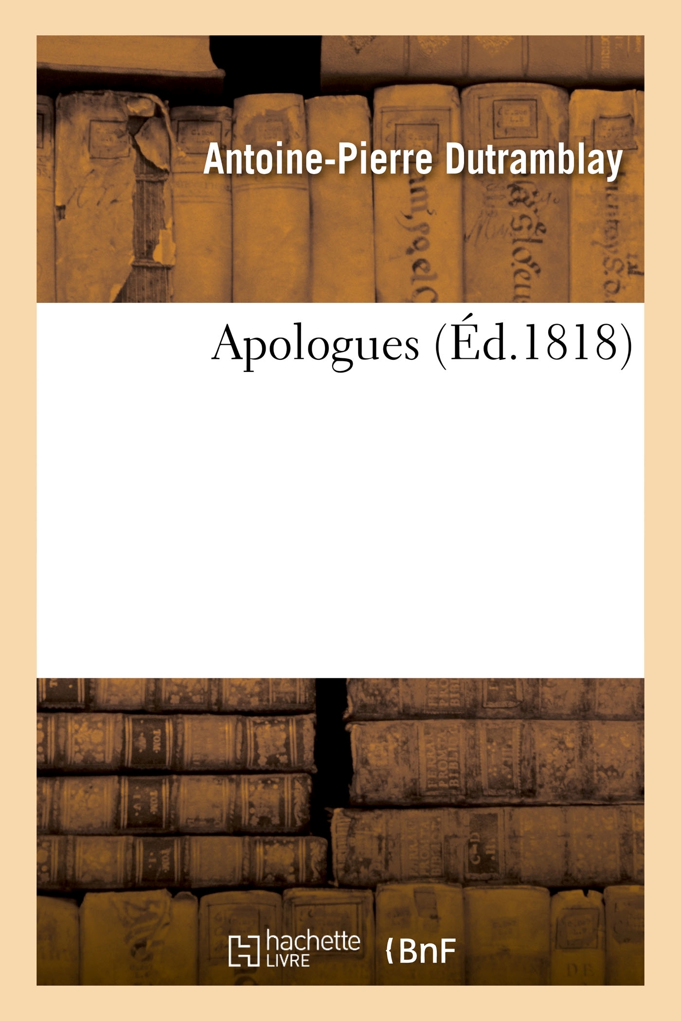 Apologues, par M*** [A.-P. Dutramblay] Date de l'édition originale : 1818 Le présent ouvrage s'inscrit dans une politique de conservation patrimoniale des ouvrages de la littérature Française mise en place avec la BNF. HACHETTE LIVRE et la BNF proposent ainsi un catalogue de titres indisponibles, la BNF ayant numérisé ces oeuvres et HACHETTE LIVRE les imprimant à la demande. Certains de ces ouvrages reflètent des courants de pensée caractéristiques de leur époque, mais qui seraient aujourd'hui jugés condamnables. Ils n'en appartiennent pas moins à l'histoire des idées en France et sont susceptibles de présenter un intérêt scientifique ou historique. Le sens de notre démarche éditoriale consiste ainsi à permettre l'accès à ces oeuvres sans pour autant que nous en cautionnions en aucune façon le contenu. Pour plus d'informations, rendez-vous sur www.hachettebnf.fr