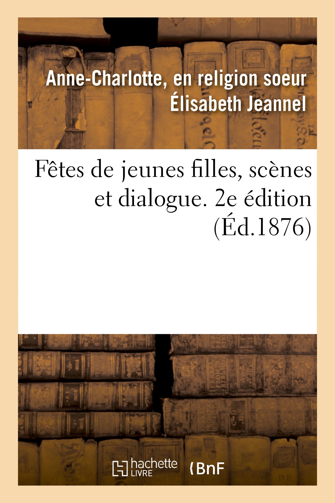 Fêtes de jeunes filles : scènes et dialogues, par l'auteur des "Fêtes d'enfants" (2e éd.) / [soeur Élisabeth Jeannel] Date de l'édition originale : 1876 Le présent ouvrage s'inscrit dans une politique de conservation patrimoniale des ouvrages de la littérature Française mise en place avec la BNF. HACHETTE LIVRE et la BNF proposent ainsi un catalogue de titres indisponibles, la BNF ayant numérisé ces oeuvres et HACHETTE LIVRE les imprimant à la demande. Certains de ces ouvrages reflètent des courants de pensée caractéristiques de leur époque, mais qui seraient aujourd'hui jugés condamnables. Ils n'en appartiennent pas moins à l'histoire des idées en France et sont susceptibles de présenter un intérêt scientifique ou historique. Le sens de notre démarche éditoriale consiste ainsi à permettre l'accès à ces oeuvres sans pour autant que nous en cautionnions en aucune façon le contenu. Pour plus d'informations, rendez-vous sur www.hachettebnf.fr