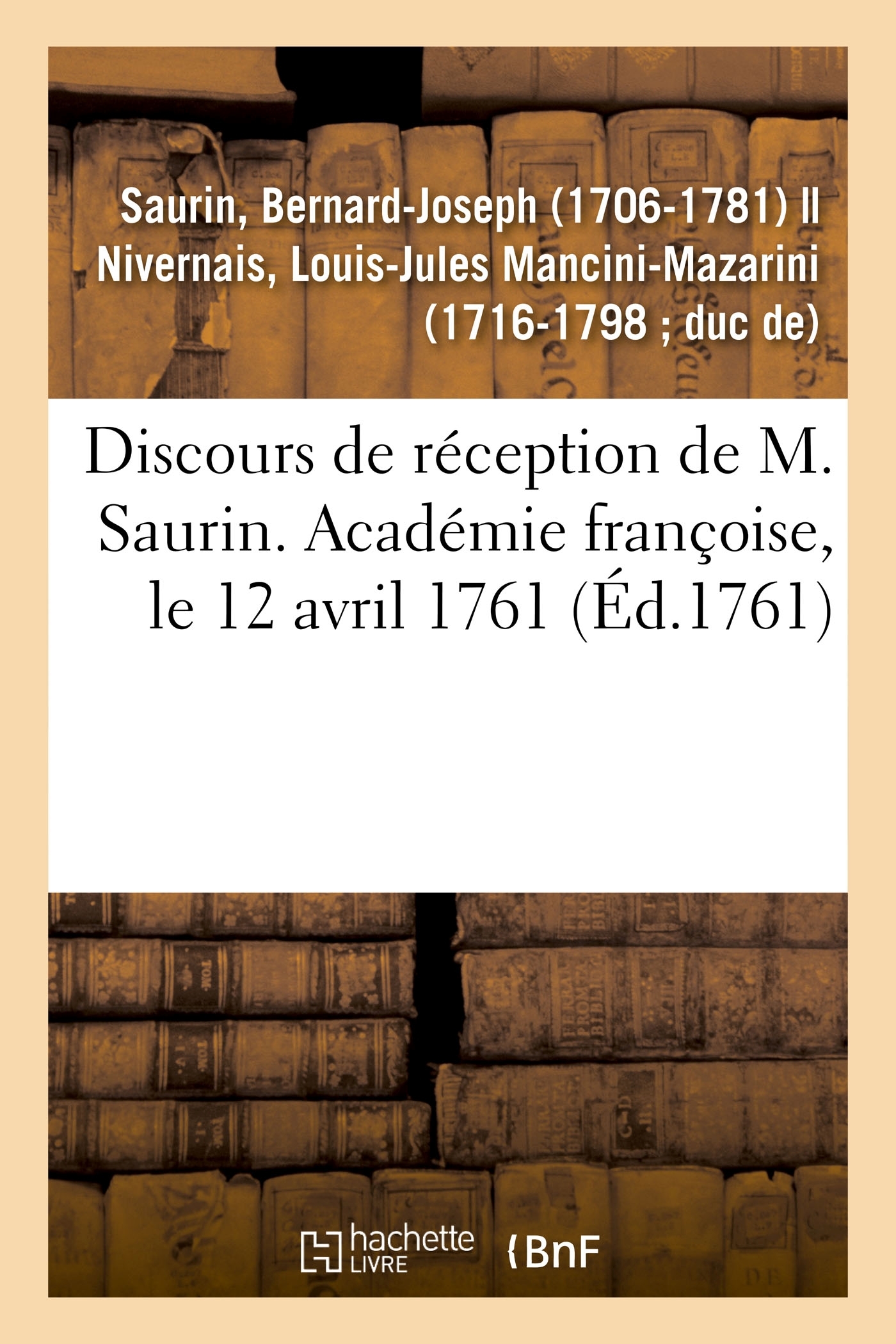 Discours prononcés dans l'Académie françoise, le lundi XII avril M. DCC. LXI, à la réception de M. Saurin Date de l'édition originale : 1761 Le présent ouvrage s'inscrit dans une politique de conservation patrimoniale des ouvrages de la littérature Française mise en place avec la BNF. HACHETTE LIVRE et la BNF proposent ainsi un catalogue de titres indisponibles, la BNF ayant numérisé ces oeuvres et HACHETTE LIVRE les imprimant à la demande. Certains de ces ouvrages reflètent des courants de pensée caractéristiques de leur époque, mais qui seraient aujourd'hui jugés condamnables. Ils n'en appartiennent pas moins à l'histoire des idées en France et sont susceptibles de présenter un intérêt scientifique ou historique. Le sens de notre démarche éditoriale consiste ainsi à permettre l'accès à ces oeuvres sans pour autant que nous en cautionnions en aucune façon le contenu. Pour plus d'informations, rendez-vous sur www.hachettebnf.fr