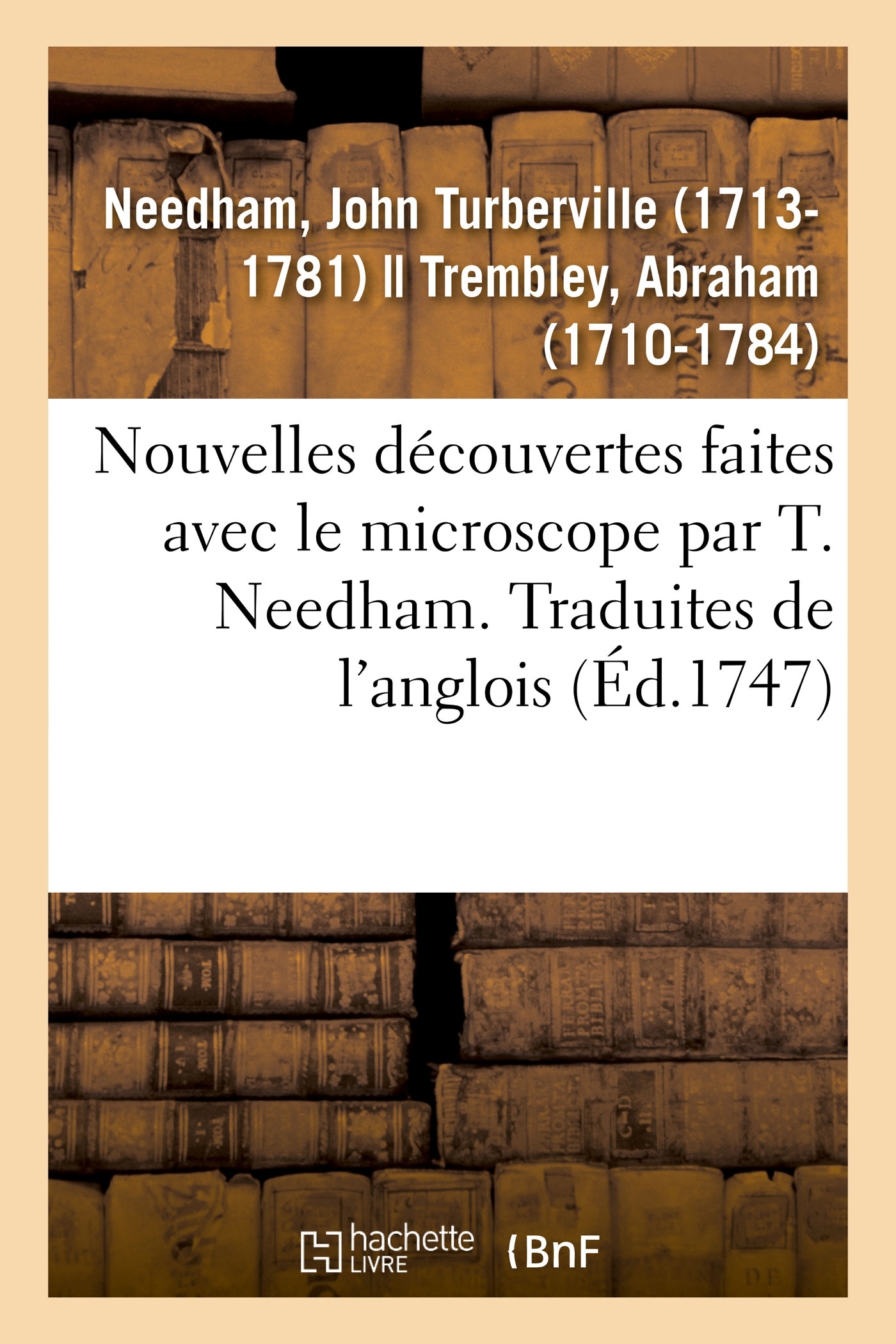 Nouvelles découvertes faites avec le microscope par T. Needham, traduites de l'anglois . Avec un mémoire sur les polypes à bouquet et sur ceux en entonnoir, par A. Trembley Date de l'édition originale : 1747 Le présent ouvrage s'inscrit dans une politique de conservation patrimoniale des ouvrages de la littérature Française mise en place avec la BNF. HACHETTE LIVRE et la BNF proposent ainsi un catalogue de titres indisponibles, la BNF ayant numérisé ces oeuvres et HACHETTE LIVRE les imprimant à la demande. Certains de ces ouvrages reflètent des courants de pensée caractéristiques de leur époque, mais qui seraient aujourd'hui jugés condamnables. Ils n'en appartiennent pas moins à l'histoire des idées en France et sont susceptibles de présenter un intérêt scientifique ou historique. Le sens de notre démarche éditoriale consiste ainsi à permettre l'accès à ces oeuvres sans pour autant que nous en cautionnions en aucune façon le contenu. Pour plus d'informations, rendez-vous sur www.hachettebnf.fr