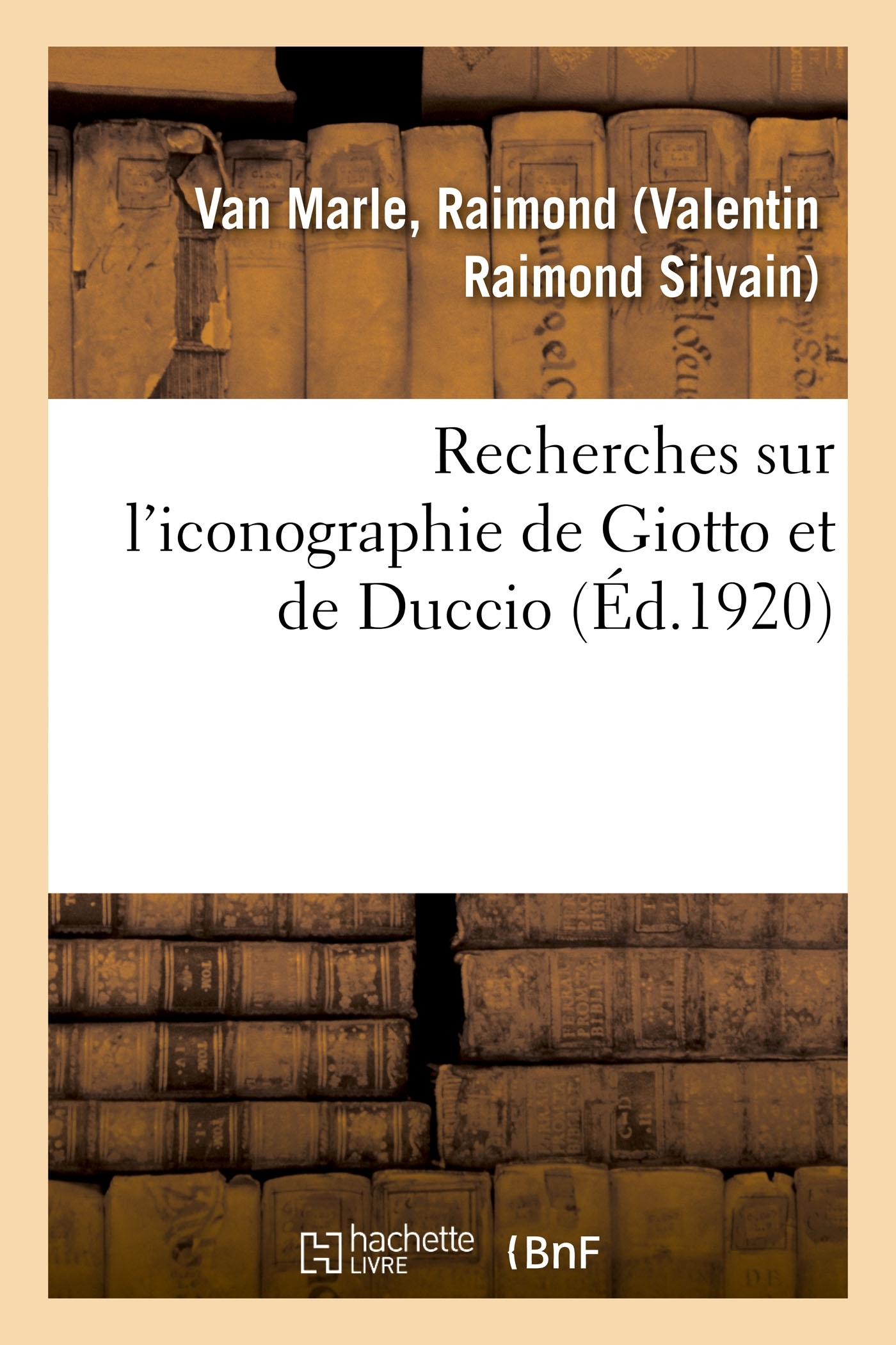 Recherches sur l'iconographie de Giotto et de Duccio / par Raimond Van Marle,... Date de l'édition originale : 1920 Le présent ouvrage s'inscrit dans une politique de conservation patrimoniale des ouvrages de la littérature Française mise en place avec la BNF. HACHETTE LIVRE et la BNF proposent ainsi un catalogue de titres indisponibles, la BNF ayant numérisé ces oeuvres et HACHETTE LIVRE les imprimant à la demande. Certains de ces ouvrages reflètent des courants de pensée caractéristiques de leur époque, mais qui seraient aujourd'hui jugés condamnables. Ils n'en appartiennent pas moins à l'histoire des idées en France et sont susceptibles de présenter un intérêt scientifique ou historique. Le sens de notre démarche éditoriale consiste ainsi à permettre l'accès à ces oeuvres sans pour autant que nous en cautionnions en aucune façon le contenu. Pour plus d'informations, rendez-vous sur www.hachettebnf.fr