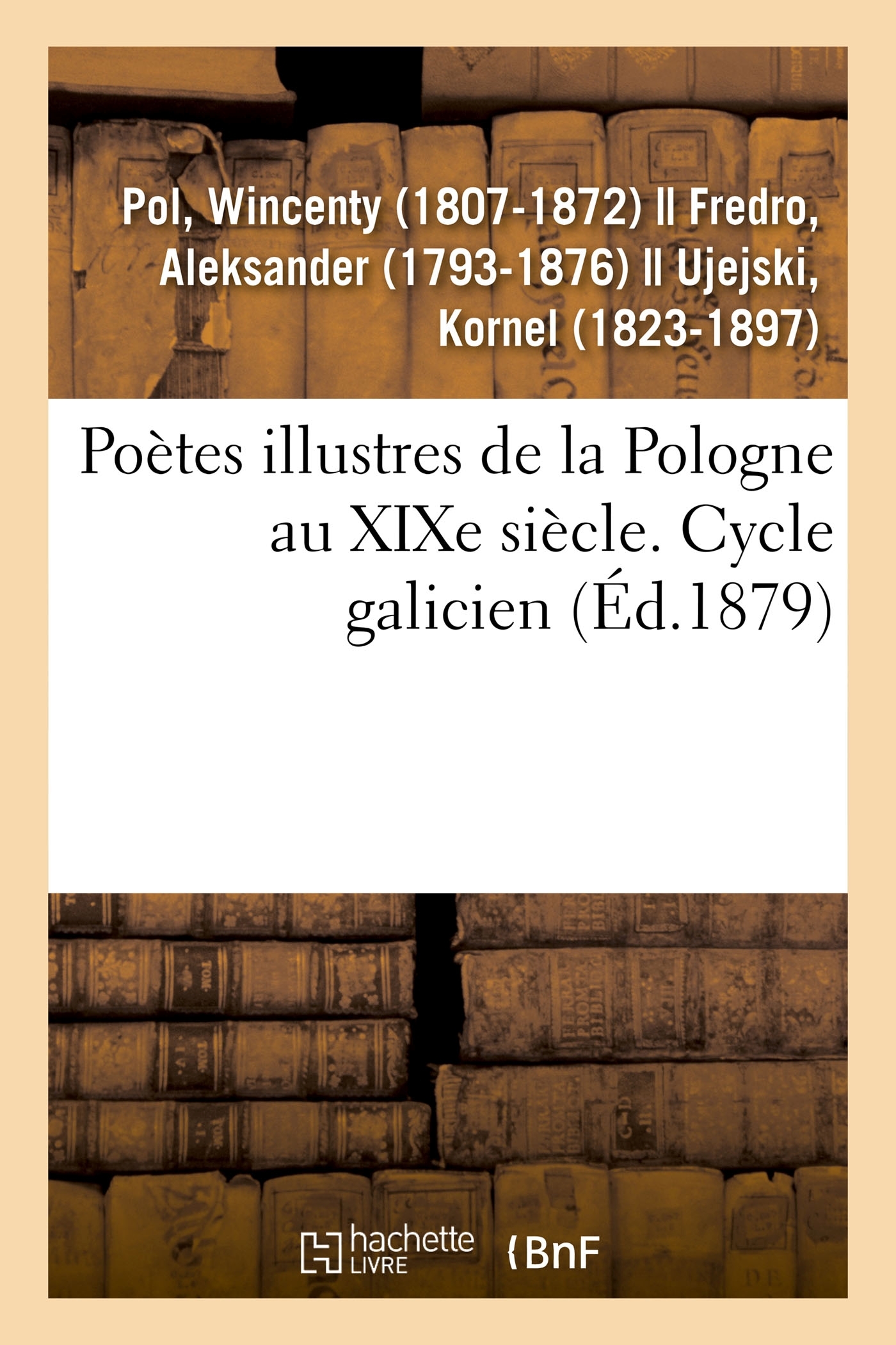 Poètes illustres de la Pologne au XIXe siècle. Cycle galicien / [traduction de Charles de Noire-Isle] Date de l'édition originale : 1879 Le présent ouvrage s'inscrit dans une politique de conservation patrimoniale des ouvrages de la littérature Française mise en place avec la BNF. HACHETTE LIVRE et la BNF proposent ainsi un catalogue de titres indisponibles, la BNF ayant numérisé ces oeuvres et HACHETTE LIVRE les imprimant à la demande. Certains de ces ouvrages reflètent des courants de pensée caractéristiques de leur époque, mais qui seraient aujourd'hui jugés condamnables. Ils n'en appartiennent pas moins à l'histoire des idées en France et sont susceptibles de présenter un intérêt scientifique ou historique. Le sens de notre démarche éditoriale consiste ainsi à permettre l'accès à ces oeuvres sans pour autant que nous en cautionnions en aucune façon le contenu. Pour plus d'informations, rendez-vous sur www.hachettebnf.fr