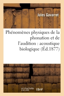 Phénomènes physiques de la phonation et de l'audition : acoustique biologique / par J. Gavarret,... Date de l'édition originale : 1877 Le présent ouvrage s'inscrit dans une politique de conservation patrimoniale des ouvrages de la littérature Française mise en place avec la BNF. HACHETTE LIVRE et la BNF proposent ainsi un catalogue de titres indisponibles, la BNF ayant numérisé ces œuvres et HACHETTE LIVRE les imprimant à la demande. Certains de ces ouvrages reflètent des courants de pensée caractéristiques de leur époque, mais qui seraient aujourd'hui jugés condamnables. Ils n'en appartiennent pas moins à l'histoire des idées en France et sont susceptibles de présenter un intérêt scientifique ou historique. Le sens de notre démarche éditoriale consiste ainsi à permettre l'accès à ces œuvres sans pour autant que nous en cautionnions en aucune façon le contenu. Pour plus d'informations, rendez-vous sur www.hachettebnf.fr