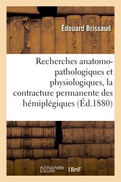 Recherches anatomo-pathologiques et physiologiques sur la contracture permanente des hémiplégiques / par É. Brissaud,... Date de l'édition originale : 1880 Le présent ouvrage s'inscrit dans une politique de conservation patrimoniale des ouvrages de la littérature Française mise en place avec la BNF. HACHETTE LIVRE et la BNF proposent ainsi un catalogue de titres indisponibles, la BNF ayant numérisé ces œuvres et HACHETTE LIVRE les imprimant à la demande. Certains de ces ouvrages reflètent des courants de pensée caractéristiques de leur époque, mais qui seraient aujourd'hui jugés condamnables. Ils n'en appartiennent pas moins à l'histoire des idées en France et sont susceptibles de présenter un intérêt scientifique ou historique. Le sens de notre démarche éditoriale consiste ainsi à permettre l'accès à ces œuvres sans pour autant que nous en cautionnions en aucune façon le contenu. Pour plus d'informations, rendez-vous sur www.hachettebnf.fr