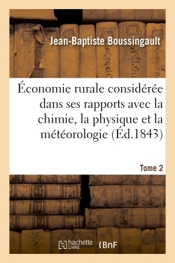 Économie rurale considérée dans ses rapports avec la chimie, la physique et la météorologie. Tome 2 / par M. J.-B. Boussingault,... Date de l'édition originale : 1843-1844 Sujet de l'ouvrage : Agriculture -- Aspect économique Le présent ouvrage s'inscrit dans une politique de conservation patrimoniale des ouvrages de la littérature Française mise en place avec la BNF. HACHETTE LIVRE et la BNF proposent ainsi un catalogue de titres indisponibles, la BNF ayant numérisé ces œuvres et HACHETTE LIVRE les imprimant à la demande. Certains de ces ouvrages reflètent des courants de pensée caractéristiques de leur époque, mais qui seraient aujourd'hui jugés condamnables. Ils n'en appartiennent pas moins à l'histoire des idées en France et sont susceptibles de présenter un intérêt scientifique ou historique. Le sens de notre démarche éditoriale consiste ainsi à permettre l'accès à ces œuvres sans pour autant que nous en cautionnions en aucune façon le contenu. Pour plus d'informations, rendez-vous sur www.hachettebnf.fr