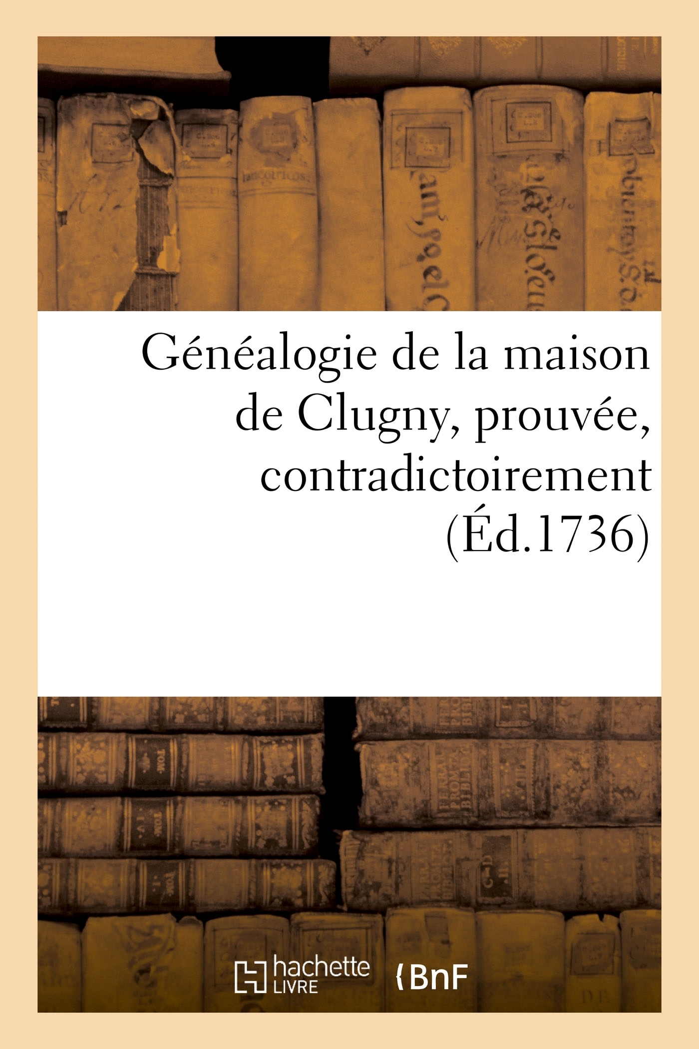 Généalogie de la maison de Clugny , prouvée, contradictoirement, sur la foi des auteurs, & des titres Date de l'édition originale : 1736 Sujet de l'ouvrage : Cluny Appartient à l'ensemble documentaire : Bourgogn1 Le présent ouvrage s'inscrit dans une politique de conservation patrimoniale des ouvrages de la littérature Française mise en place avec la BNF. HACHETTE LIVRE et la BNF proposent ainsi un catalogue de titres indisponibles, la BNF ayant numérisé ces oeuvres et HACHETTE LIVRE les imprimant à la demande. Certains de ces ouvrages reflètent des courants de pensée caractéristiques de leur époque, mais qui seraient aujourd'hui jugés condamnables. Ils n'en appartiennent pas moins à l'histoire des idées en France et sont susceptibles de présenter un intérêt scientifique ou historique. Le sens de notre démarche éditoriale consiste ainsi à permettre l'accès à ces oeuvres sans pour autant que nous en cautionnions en aucune façon le contenu. Pour plus d'informations, rendez-vous sur www.hachettebnf.fr