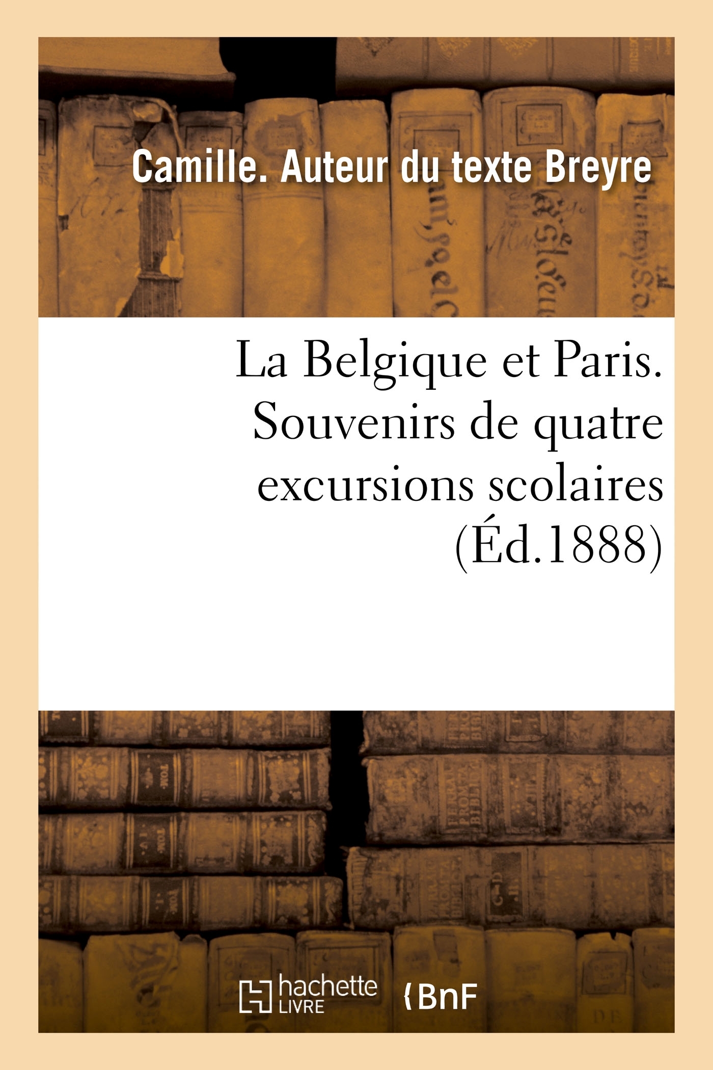 La Belgique et Paris : souvenirs de quatre excursions scolaires faites avec des élèves de l'école moyenne de Liège en 1878, 1882, 1886, 1887 / Camille Breyre,... Date de l'édition originale : 1888 Le présent ouvrage s'inscrit dans une politique de conservation patrimoniale des ouvrages de la littérature Française mise en place avec la BNF. HACHETTE LIVRE et la BNF proposent ainsi un catalogue de titres indisponibles, la BNF ayant numérisé ces oeuvres et HACHETTE LIVRE les imprimant à la demande. Certains de ces ouvrages reflètent des courants de pensée caractéristiques de leur époque, mais qui seraient aujourd'hui jugés condamnables. Ils n'en appartiennent pas moins à l'histoire des idées en France et sont susceptibles de présenter un intérêt scientifique ou historique. Le sens de notre démarche éditoriale consiste ainsi à permettre l'accès à ces oeuvres sans pour autant que nous en cautionnions en aucune façon le contenu. Pour plus d'informations, rendez-vous sur www.hachettebnf.fr