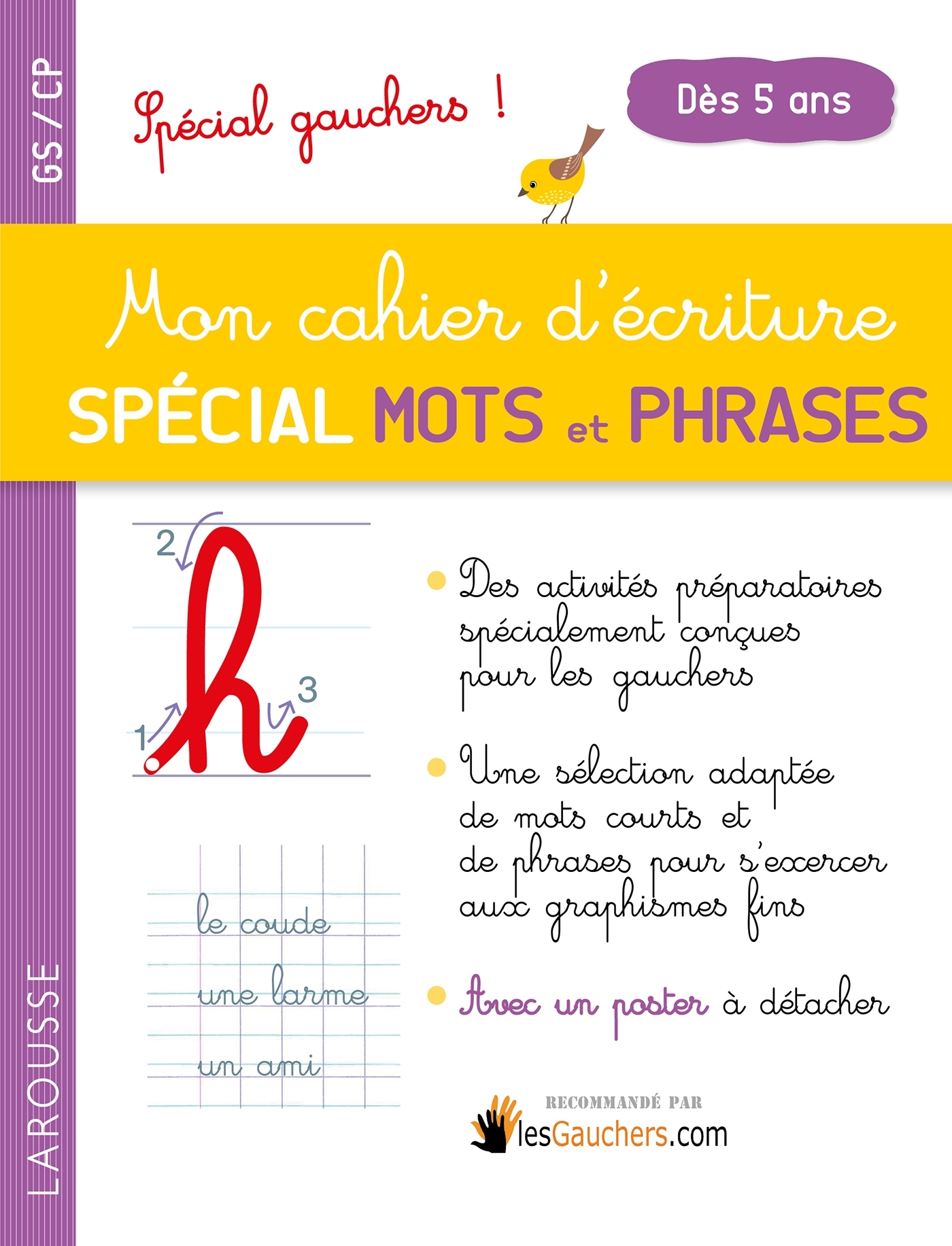 Un cahier d'écriture spécialement conçu pour les enfants gauchers pour leur apprendre à reproduire des premiers mots et des premières phrases en lettres cursives. Pour les enfants en GS / CP. Il contient : des exercices de préparation par le graphisme; des pages d'écriture qui reproduisent la page du cahier de l'école avec des modèles pour apprendre à écrire des mots et des phrases en restant bien dans les interlignes; des pages consacrées à la reproduction des chiffres. Pour faciliter les exercices de graphisme pour les enfants gauchers, les pages se présentent à l'italienne et les modèles sont placés à droite des pages.