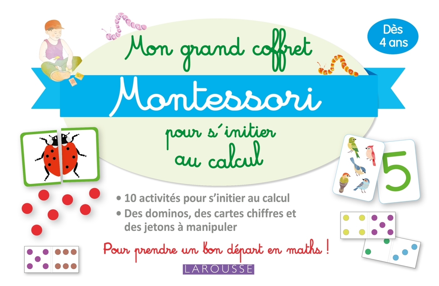La pédagogie Montessori est particulièrement efficace pour apprendre les fondamentaux des mathématiques et du calcul : la manipulation d'éléments concrets précède l'apprentissage de l'abstraction et le prépare. Le coffret propose un support pour la manipulation, 30 cartes chiffres, des cartes symboles (+, - et =), et des éléments à manipuler pour compter, ainsi qu'un livret explicatif de 16 pages destinés aux parents et aux éducateurs.