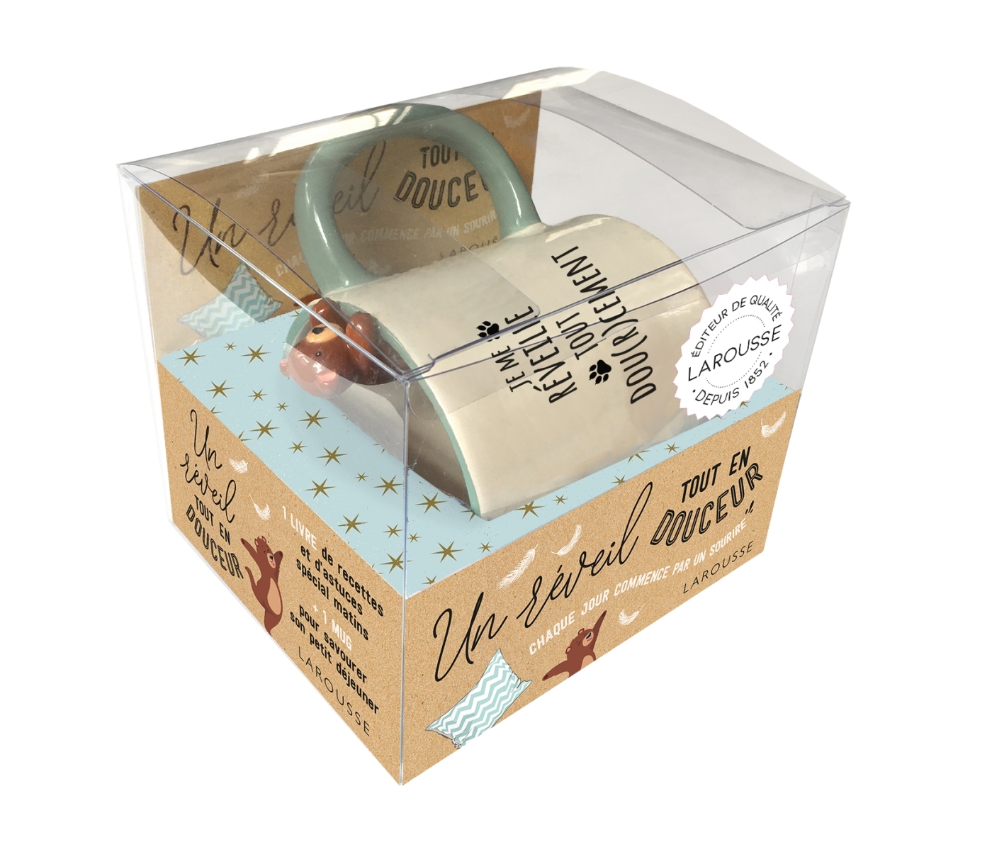 Dans ce coffret vous trouverez : 1 mug XL pour savourer votre petit déjeuner et en finir avec les matins grognons et 1 livre de 32 pages avec des astuces bien-être, des recettes gourmandes et toniques et des citations pour bien commencer la journée. Souriez ! Un petit ours sort du mug !