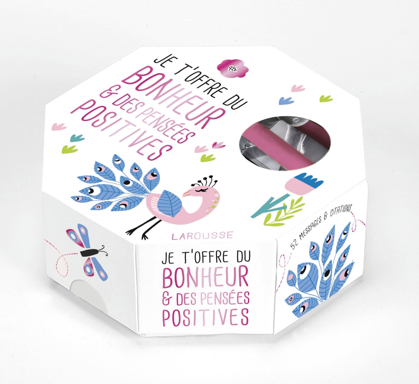 52 messages de bonheur et de pensées positives à dérouler contenant chacune une photo et une citation ou un proverbe à découvrir au fil des semaines.