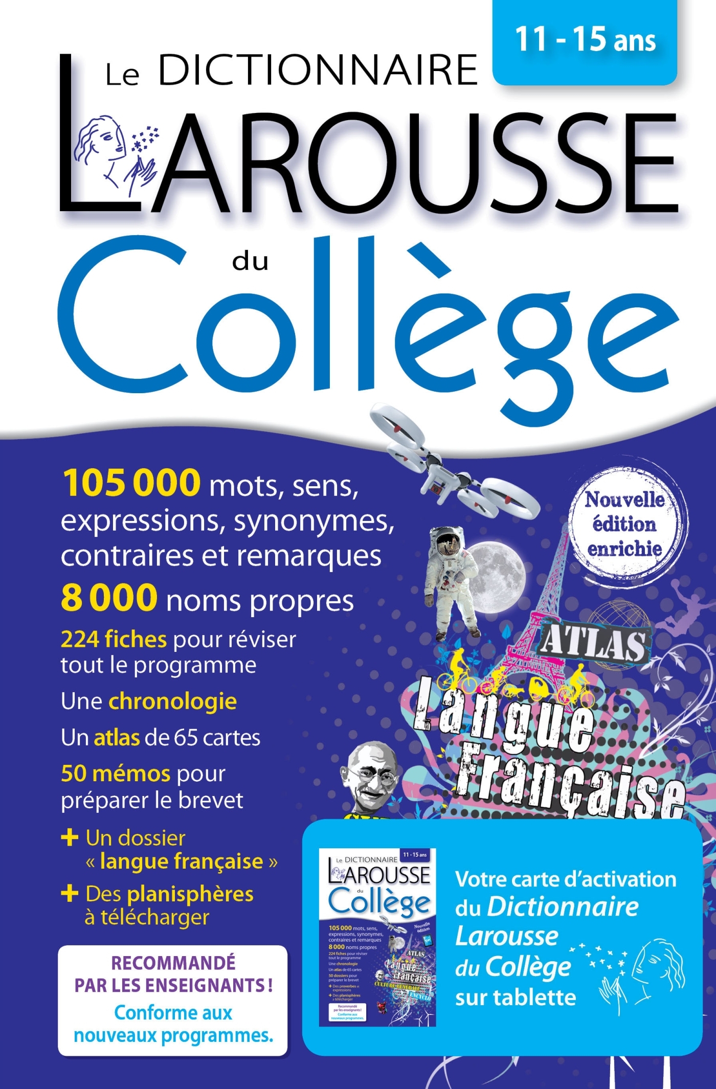 Un dictionnaire indispensable pour les élèves du collège ! 42 000 mots et sens , 8000 noms propres, 224 fiches par matière pour revoir tout le programme du collège et 50 dossiers thématiques pour se préparer aux épreuves du brevet des collèges Et aussi : 900 compléments encyclopédiques, des rappels sur l'étymologie et la phonétique des mots, 45 000 synonymes et contraires, 3 500 remarques de grammaire et 115 tableaux de conjugaison, un atlas de 65 cartes, une chronologie de 1 200 dates. Avec un dossier sur la programmation informatique et des planisphères à télécharger, et une carte donnant accès à une version numérique disponible sur tablette. Le plus de l'édition 2019 : intégration de la réforme de l'orthographe au sein même des entrées du dictionnaire